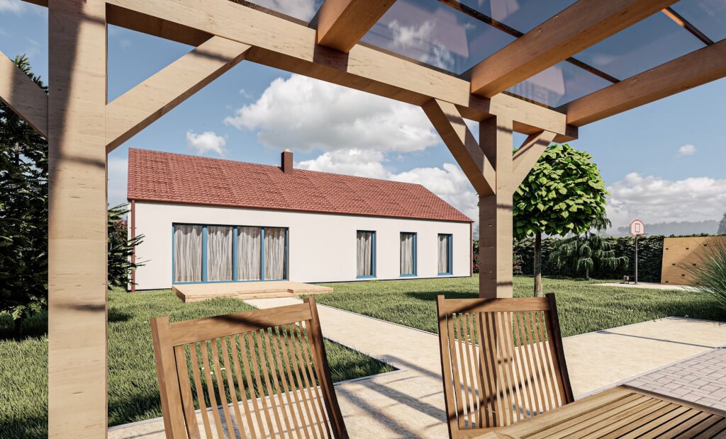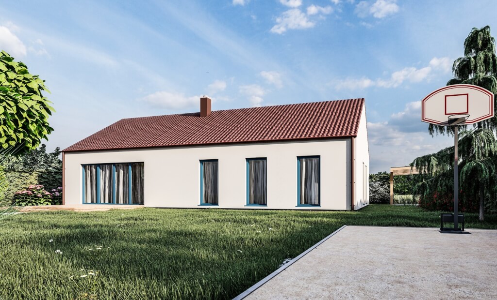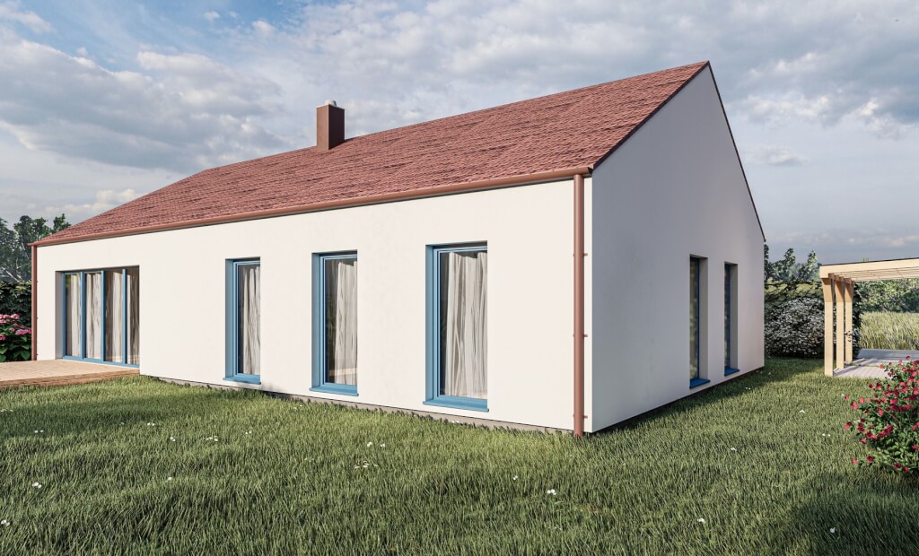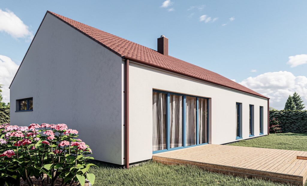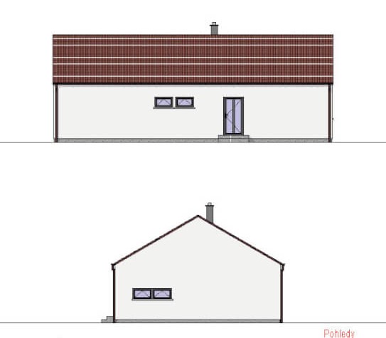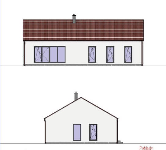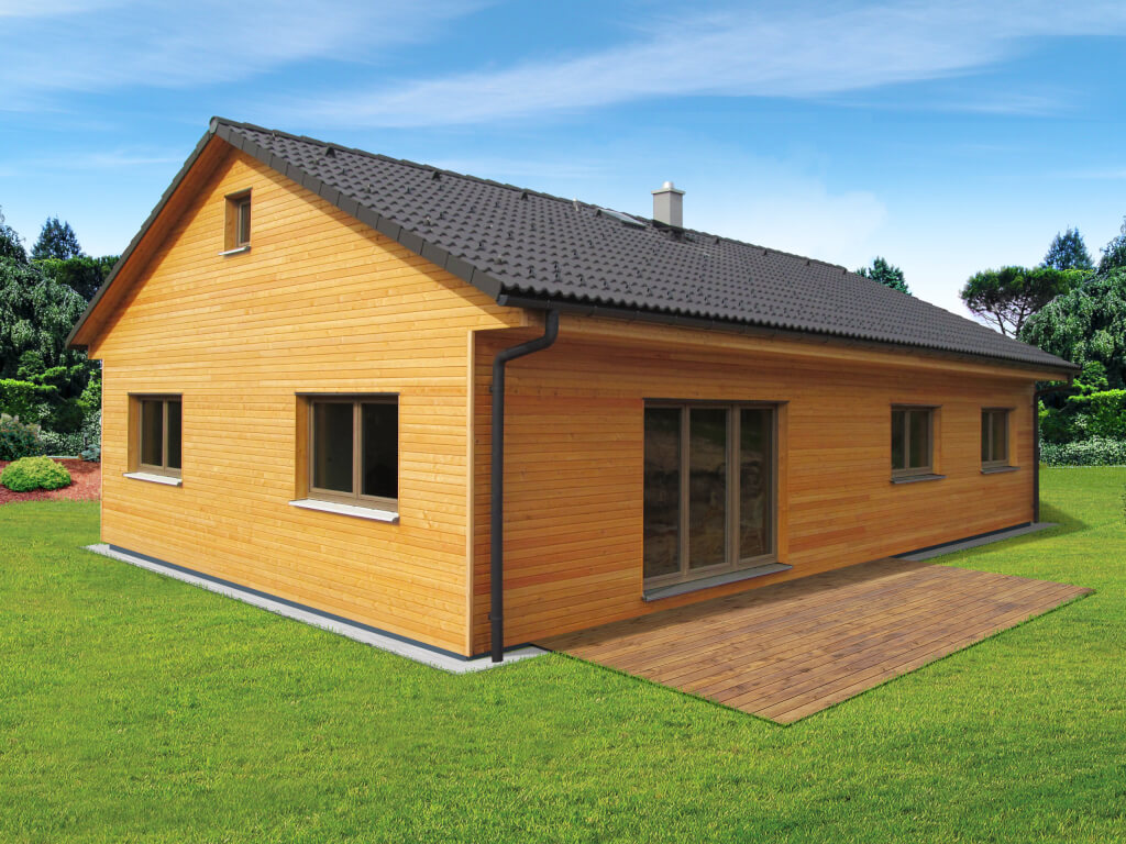 Jednoduchý, 5pokojový bungalov klasického tvaru se sedlovou střechou. Moderní vzhled domu zajišťuje dřevěný obklad na fasádě, který může být využit buď částečně nebo může tvořit i celou fasádu domu.