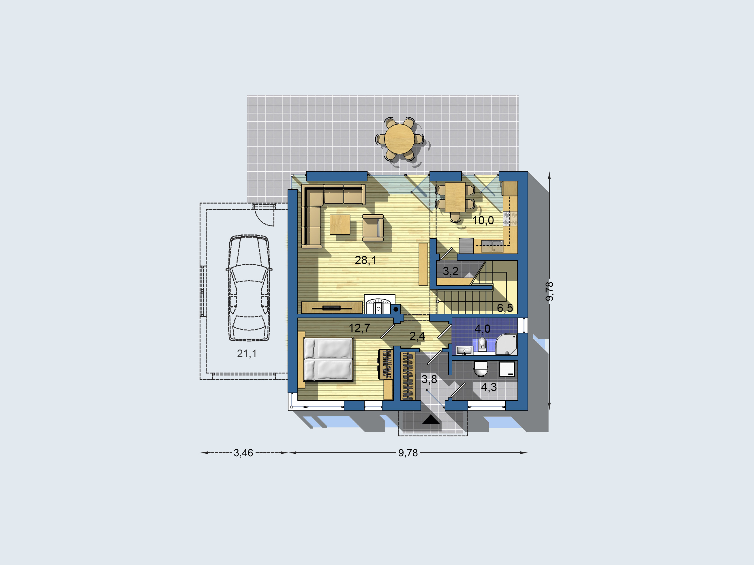 Praktický patrový dům s efektivně využitým půdorysem a plnou výškou patra. Výhodou domu je jeho jednoduché konstrukční řešení umožňující rychlou a nenáročnou výstavbu.