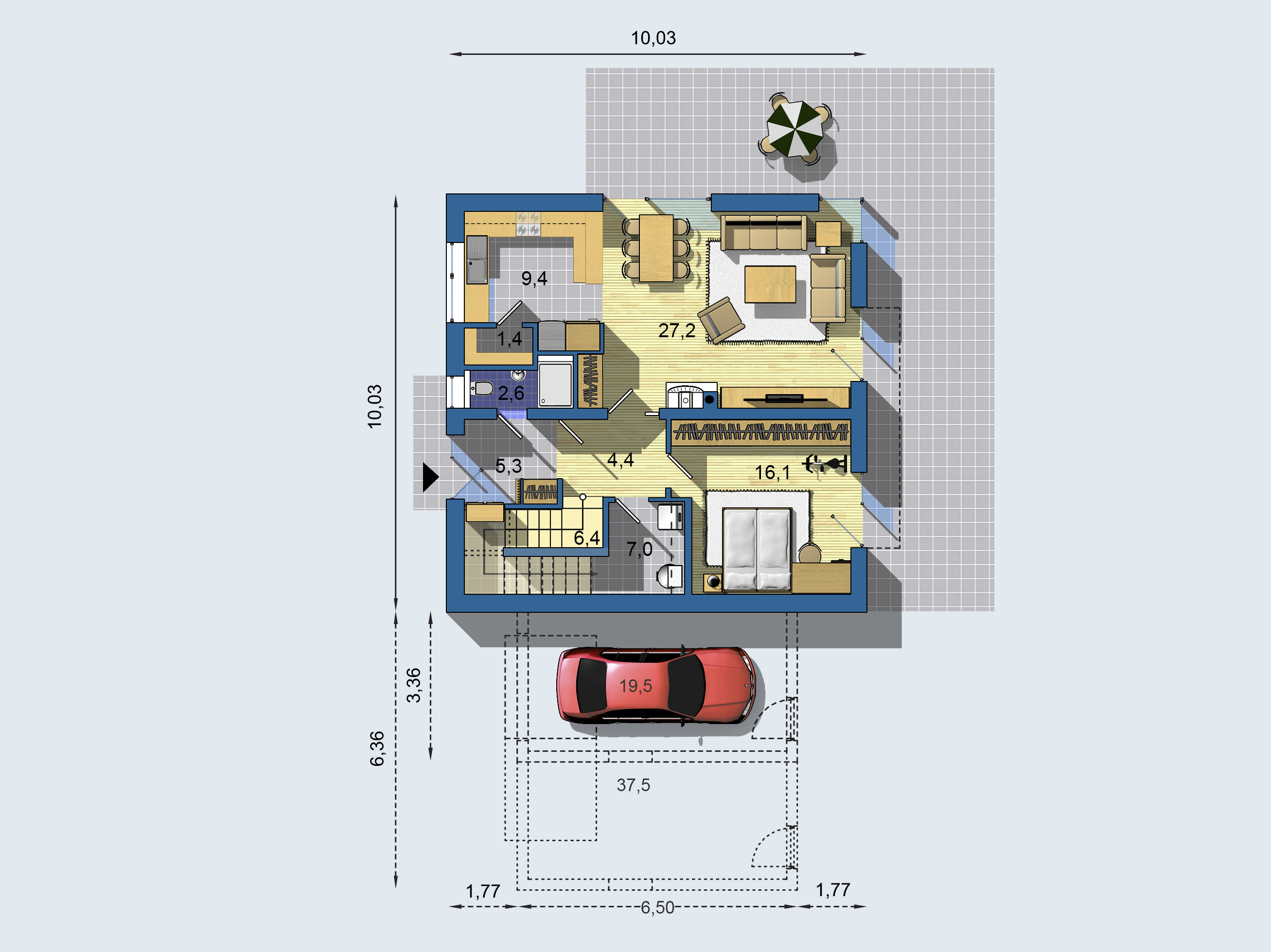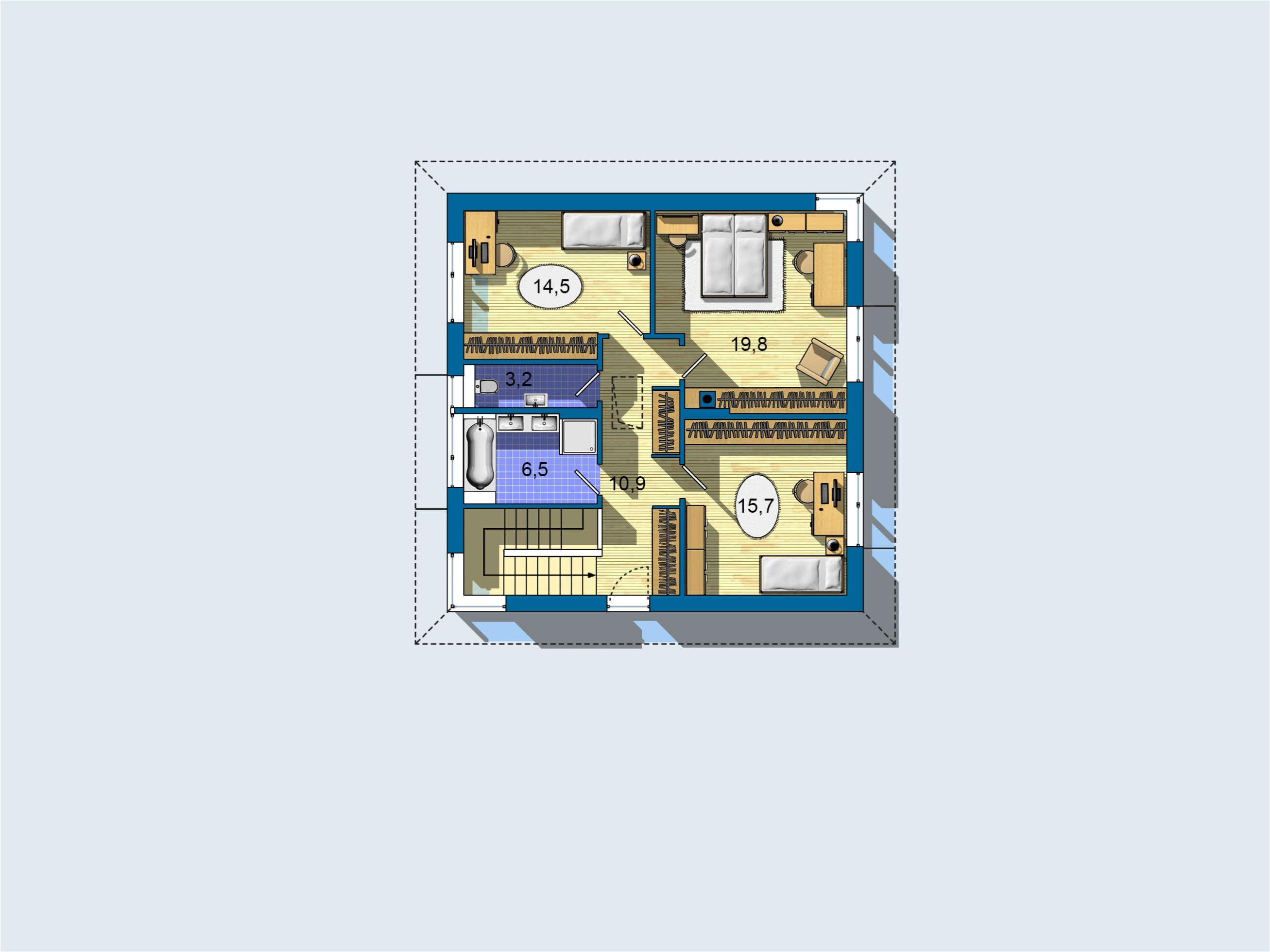 Praktický dvoupodlažní rodinný dům s plnohodnotnou výškou podlaží a malým půdorysem. Dům je vhodný i pro umístění na menší parcely.