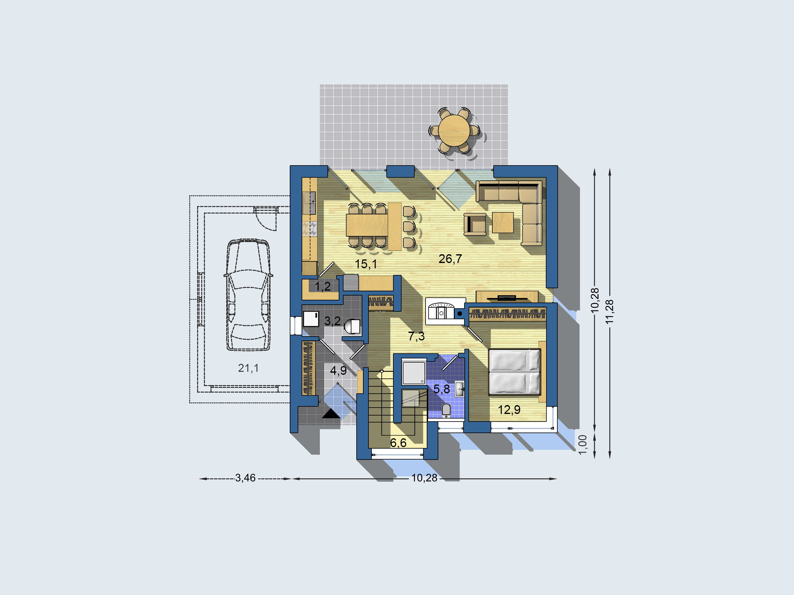 V přízemí se nachází velkorysý obývací prostor propojený s jídelnou a kuchyňským koutem. Velká francouzská okna zajišťují dostatek světla v interiéru i propojení s terasou. Nechybí ani centrálně umístěný krb a spíž pro pohodlné skladování potravin.