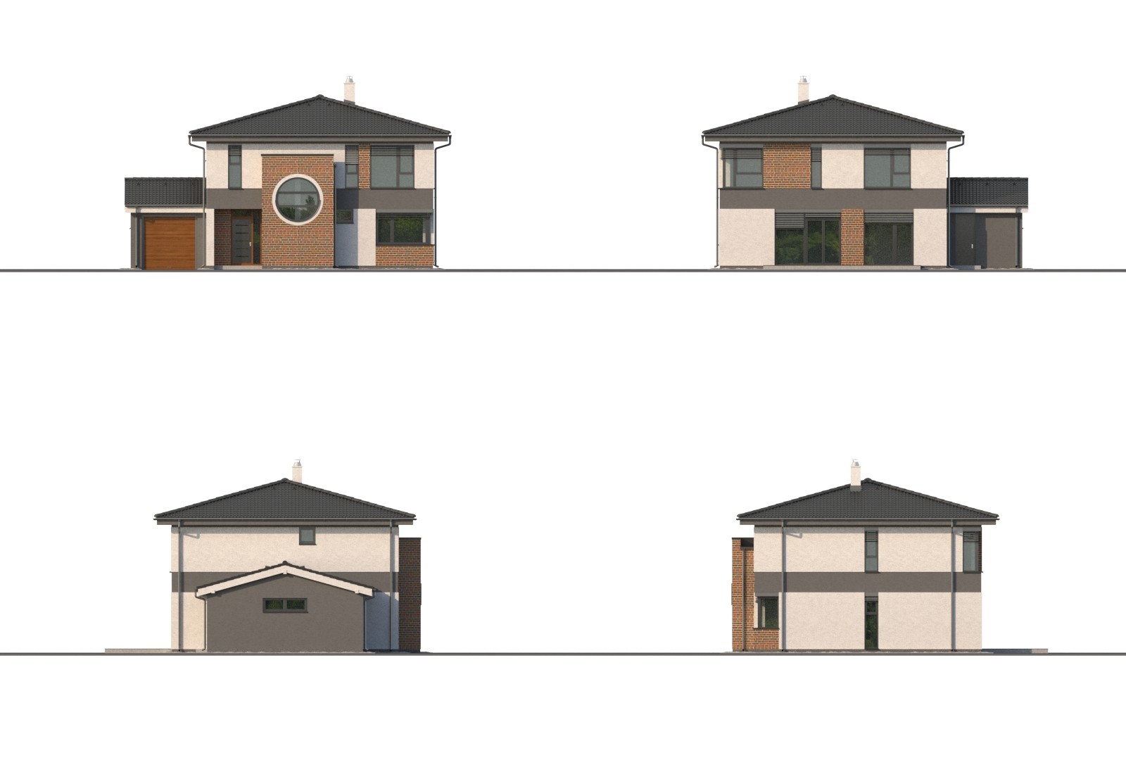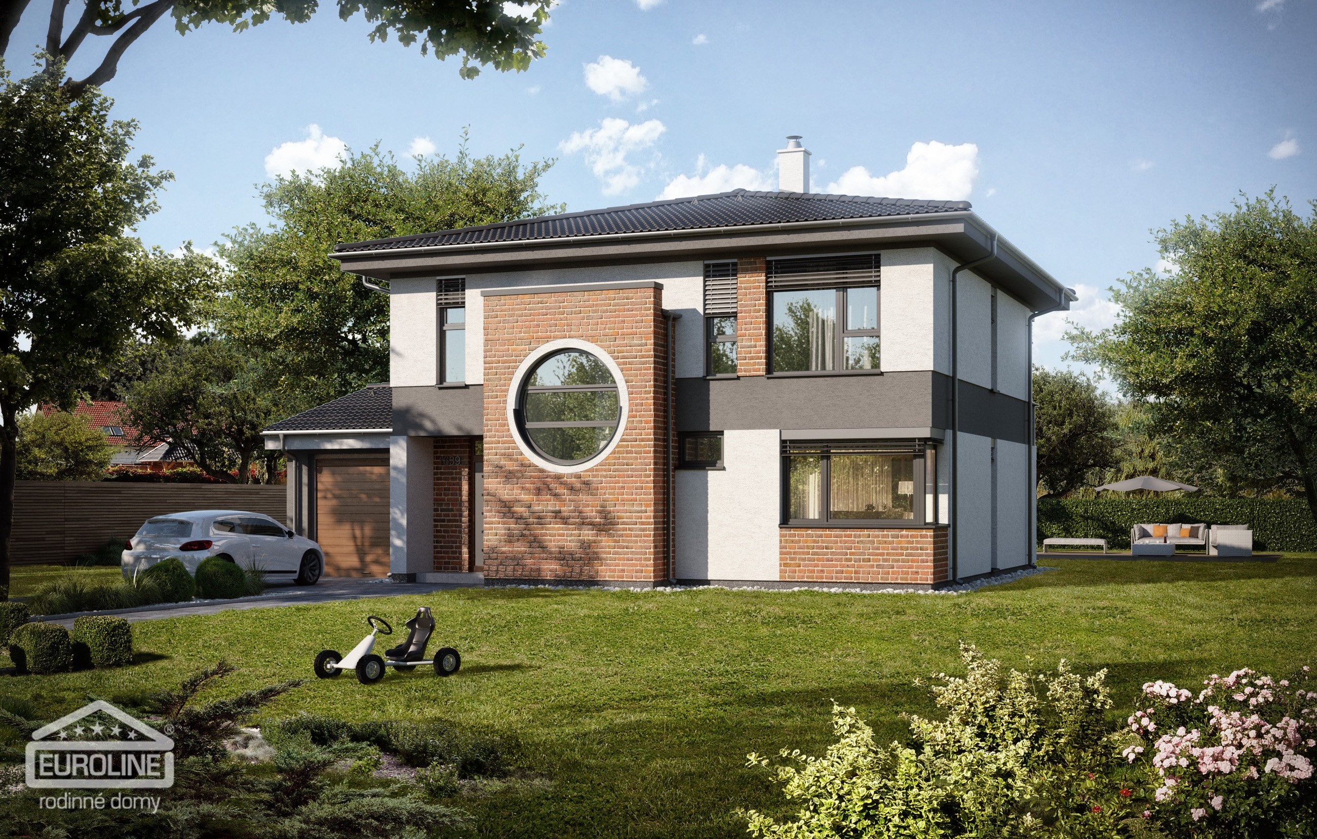 Kompaktní dvoupodlažní rodinný dům s plnohodnotnou výškou podlaží, ideální pro pohodlné bydlení větší rodiny se 2 až 3 dětmi. Atraktivním architektonickým doplňkem je částečné obložení fasády cihlovým obkladem.