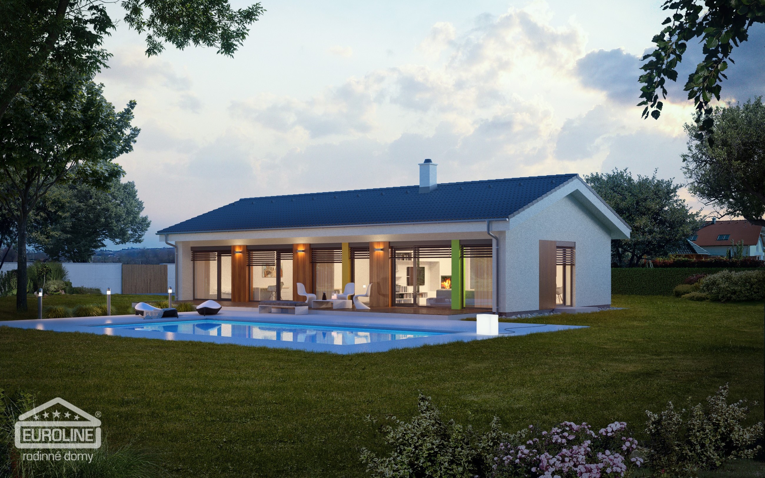 Praktický 4pokojový bungalov moderního vzhledu s efektivním využitím půdorysu. Všechny obytné místnosti jsou orientovány do zahrady a díky francouzským oknům mají výstup na terasu. Výhodou domu je jeho jednoduchá konstrukce bez pevného stropu se sádrokartonovým podhledem, což zajišťuje rychlou výstavbu.