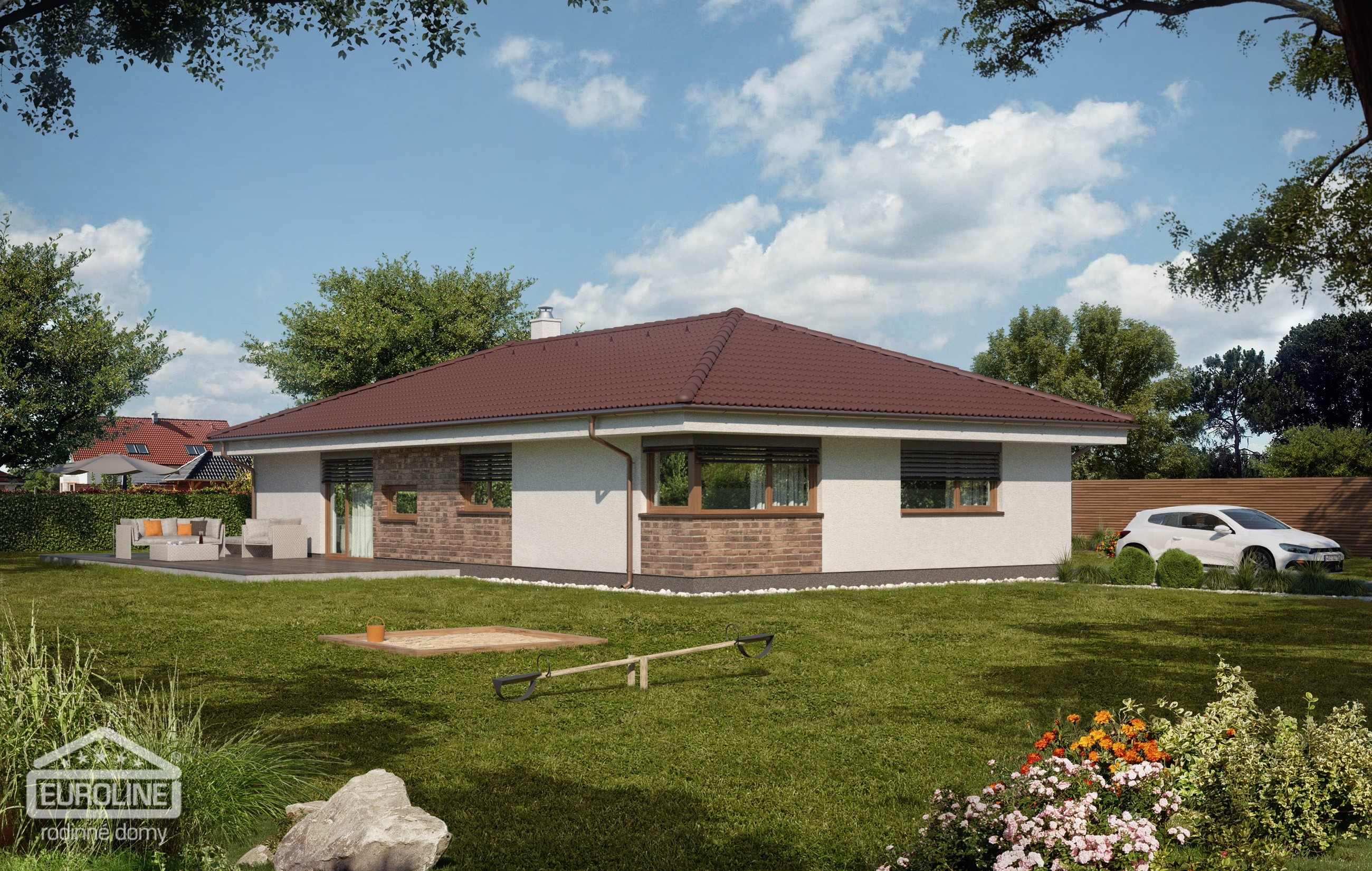 Cena včetně DPH. Orientační cena domu na klíč vypočtená na základě průměrných cen při optimalizovaném standardu použitých materiálů a technologií v poměru cena/výkon. Cena obsahuje základovou desku. Cena neobsahuje terasu, krbovou vložku, žaluzie, systém řízeného větrání s rekuperací, kuchyňskou linku ani žádný jiný nábytek, oplocení pozemku, zpevněné plochy na pozemku, sadové úpravy.