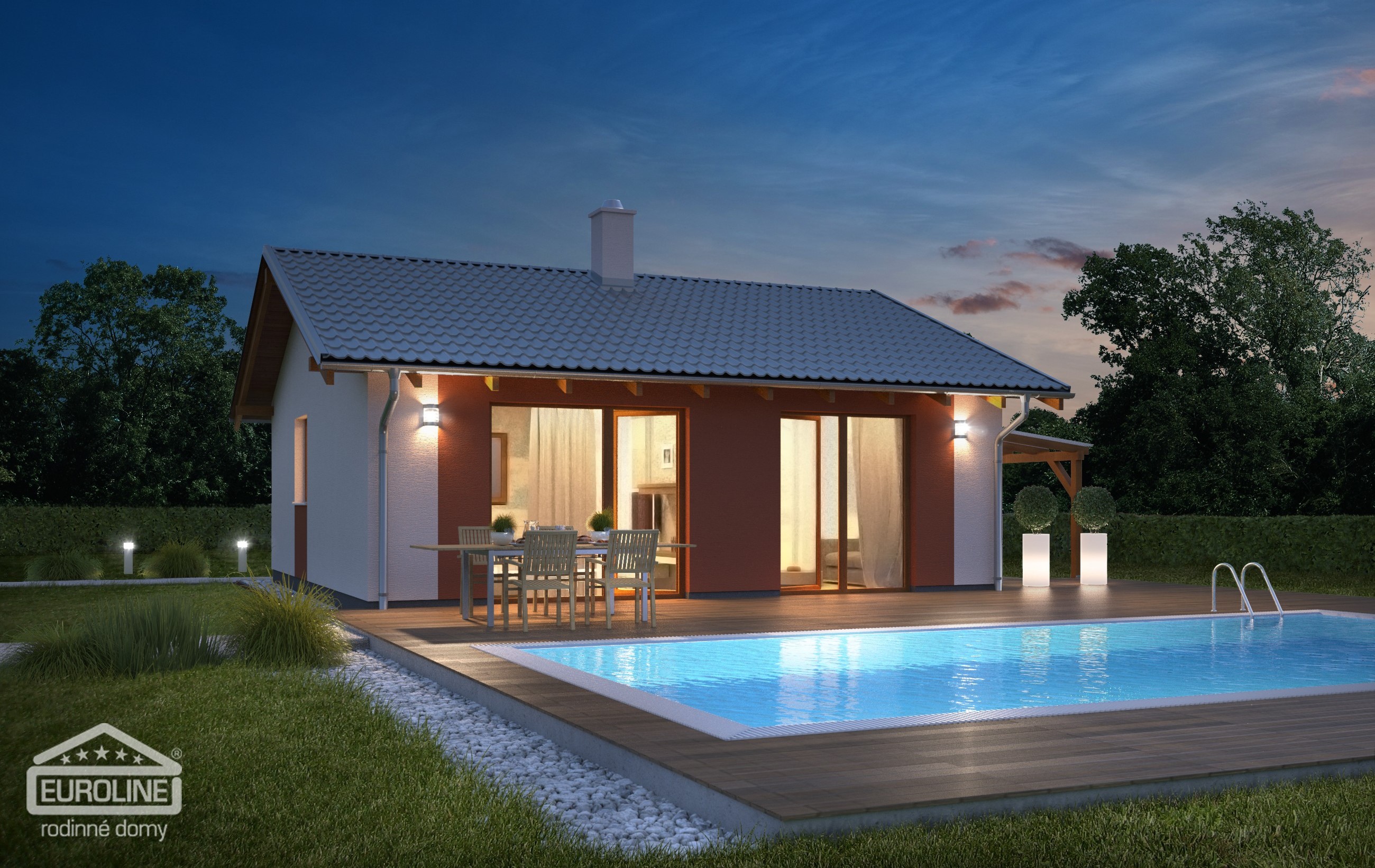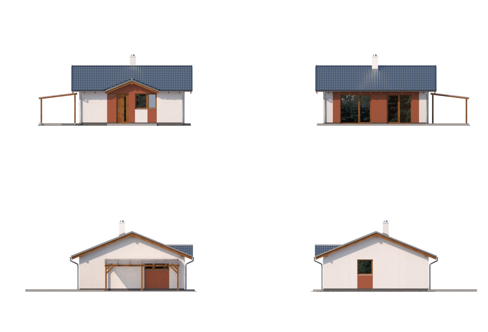 Malý, jednoduchý bungalov se sedlovou střechou, vhodný i jako chata nebo víkendový dům na horách. Výhodou je jednoduché konstrukční řešení bez pevného stropu, což zajišťuje rychlou a nenáročnou výstavbu.