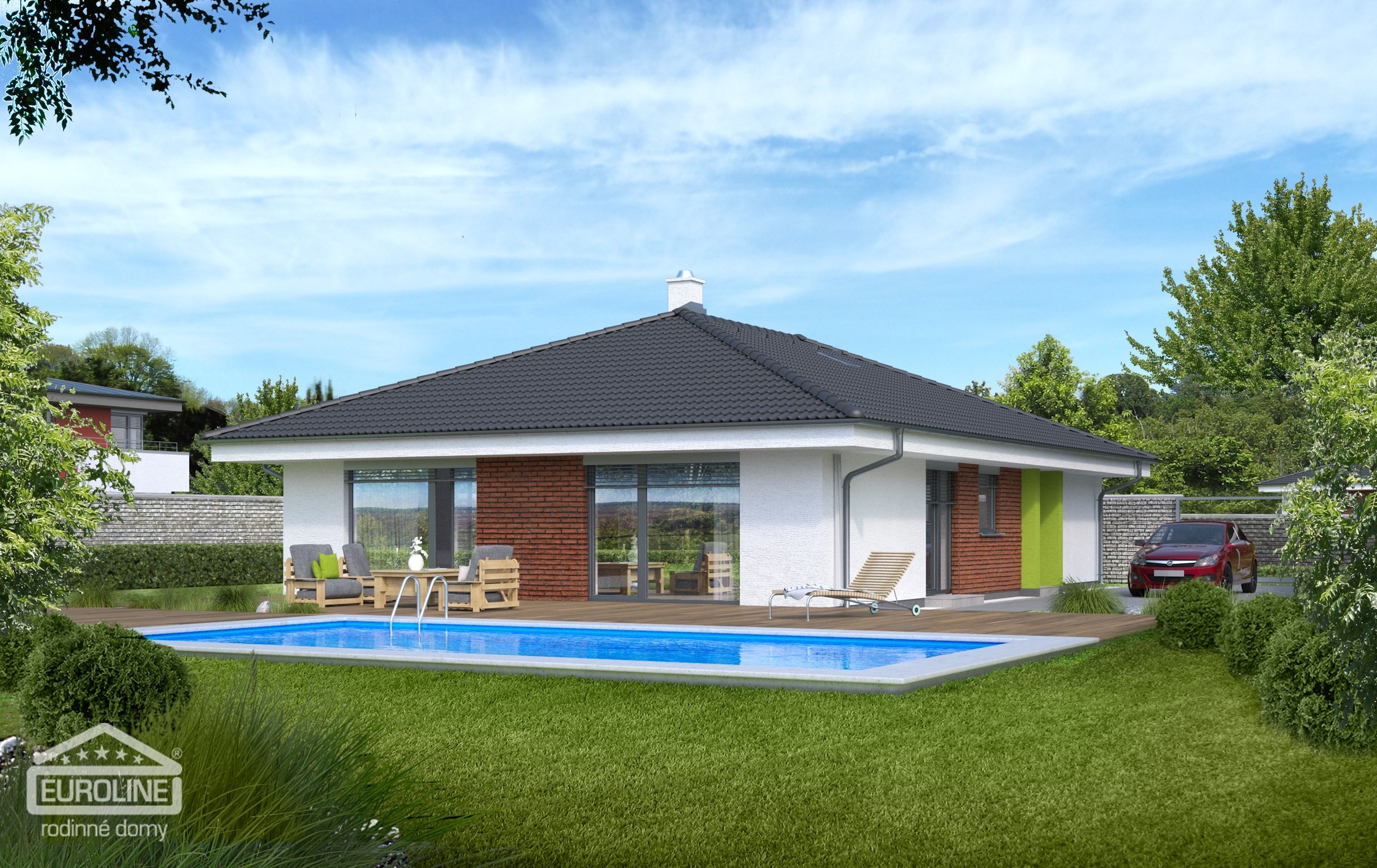 Cena včetně DPH. Orientační cena domu na klíč vypočtená na základě průměrných cen při optimalizovaném standardu použitých materiálů a technologií v poměru cena/výkon. Cena obsahuje základovou desku. Cena neobsahuje terasu, krbovou vložku, žaluzie, systém řízeného větrání s rekuperací, kuchyňskou linku ani žádný jiný nábytek, oplocení pozemku, zpevněné plochy na pozemku, sadové úpravy.