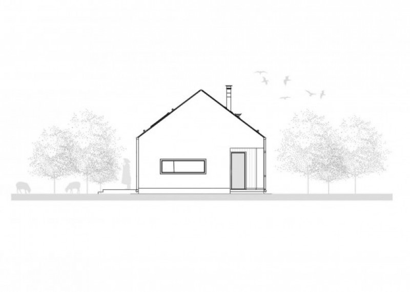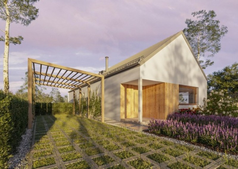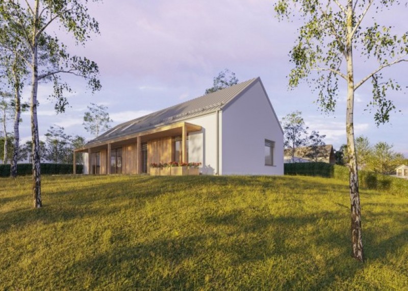 Moderní, ekonomický 4pokojový bungalov se sedlovou střechou. Použití dřevěného obkladu na části fasády dodává domu atraktivní vzhled a zároveň vyjadřuje pokoru k přírodě.