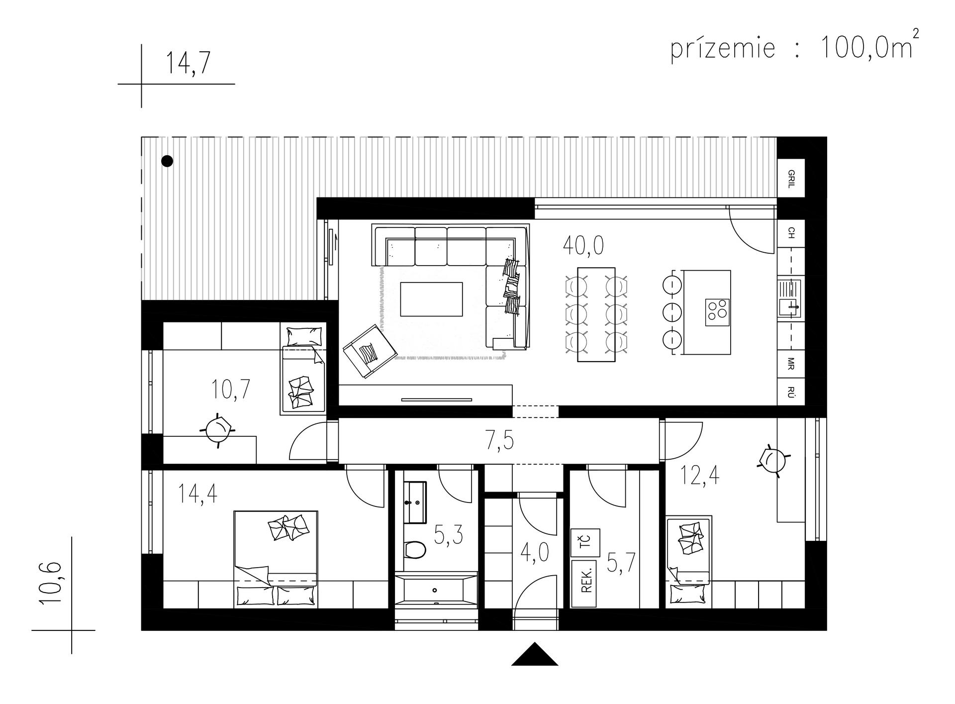 Srdcem domu je velkorysý obytný prostor s jídelnou a kuchyní. Velké prosklené plochy zajišťují dokonalé prosvětlení interiéru a ničím nerušený výhled do zahrady.
