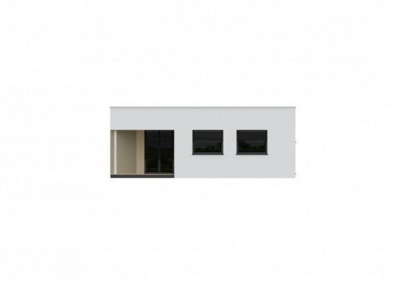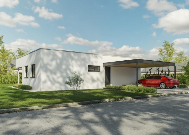 Jednoduchý, minimalistický bungalov s plochou střechou a čistými liniemi. Dům je ideální pro pohodlné bydlení rodiny se 2 dětmi. Zajímavým a zároveň praktickým architektonickým prvkem je terasa krytá přesahem střechy.