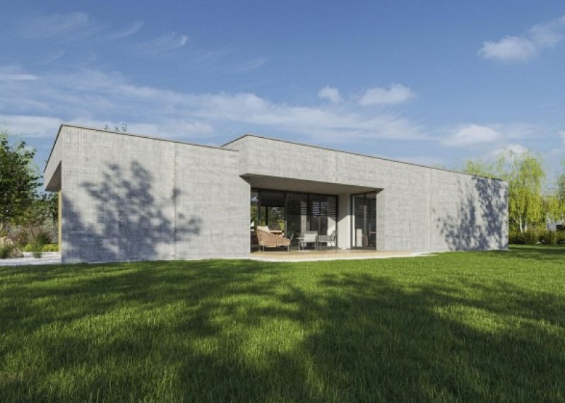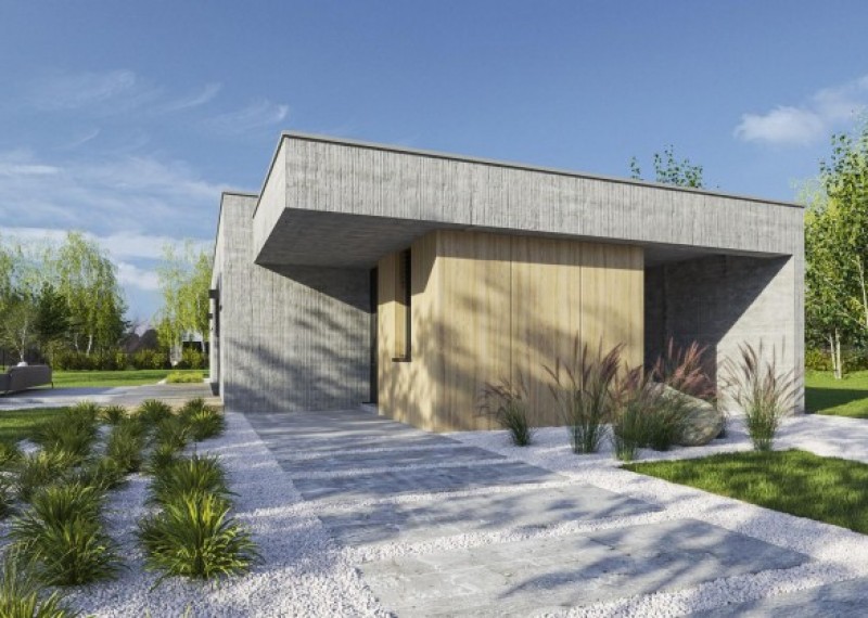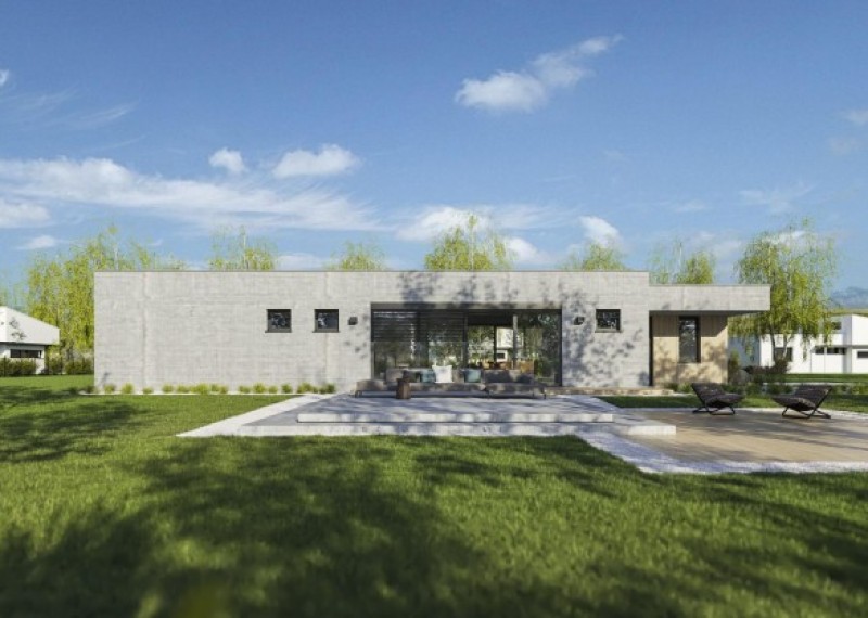 Moderní funkcionalistický bungalov s monolitickým ztvárněním fasády a čistým, promyšleným designem. Dům je ideální pro pohodlné bydlení 4členné rodiny. Zajímavým a zároveň praktickým prvkem je překrytí vstupu a teras přesahem střechy.