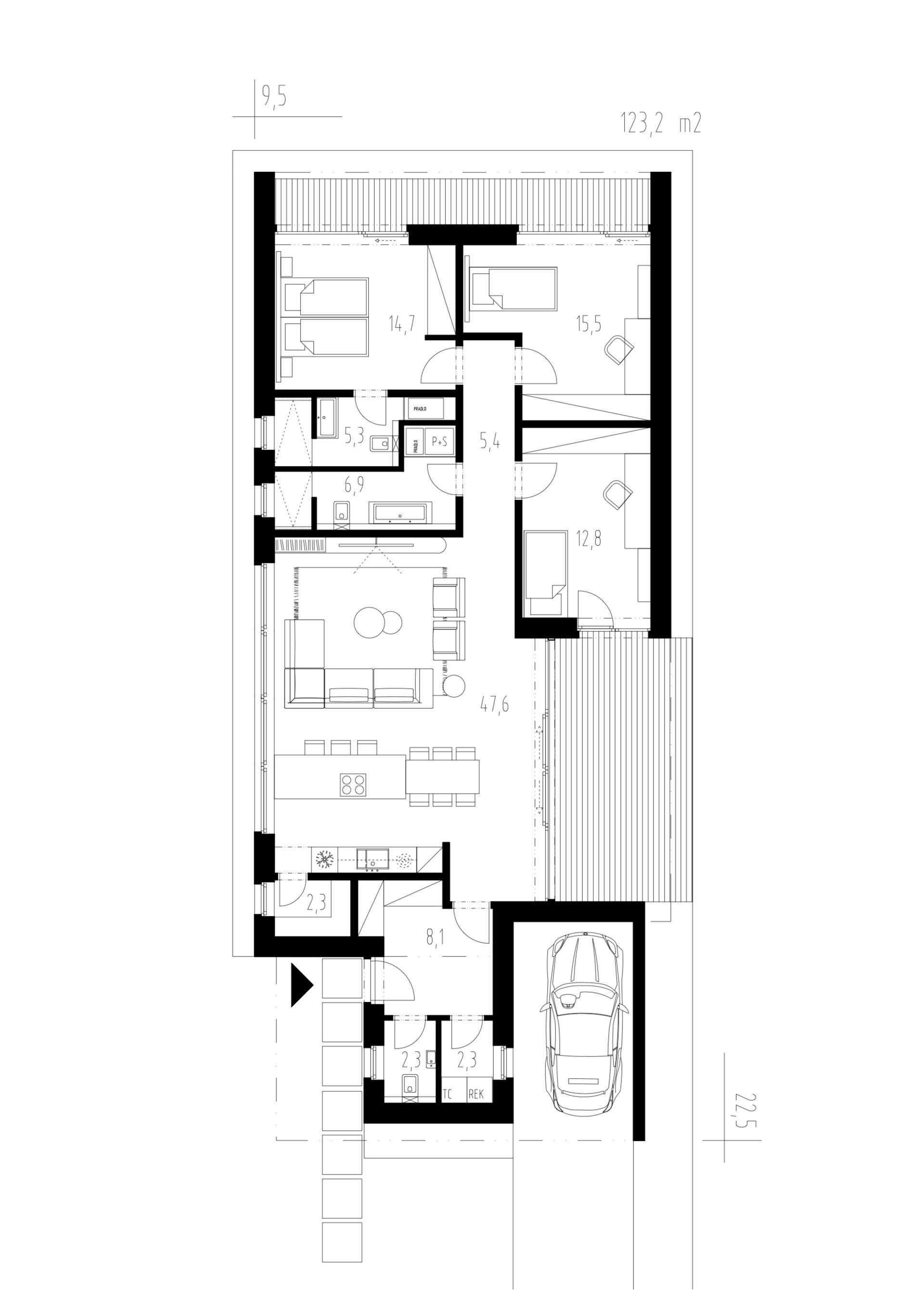 Srdcem domu je obytný velkoprostor propojený s jídelnou a kuchyní. Velké prosklené plochy zajišťují dokonalé prosvětlení interiéru, ničím nerušený výhled do zahrady a přirozené propojení s terasou. V kuchyni nechybí praktická spíž.