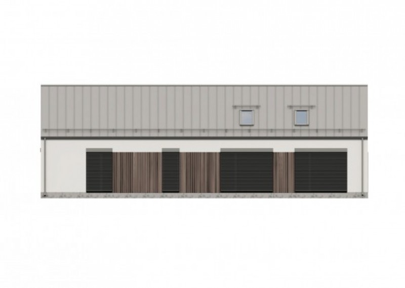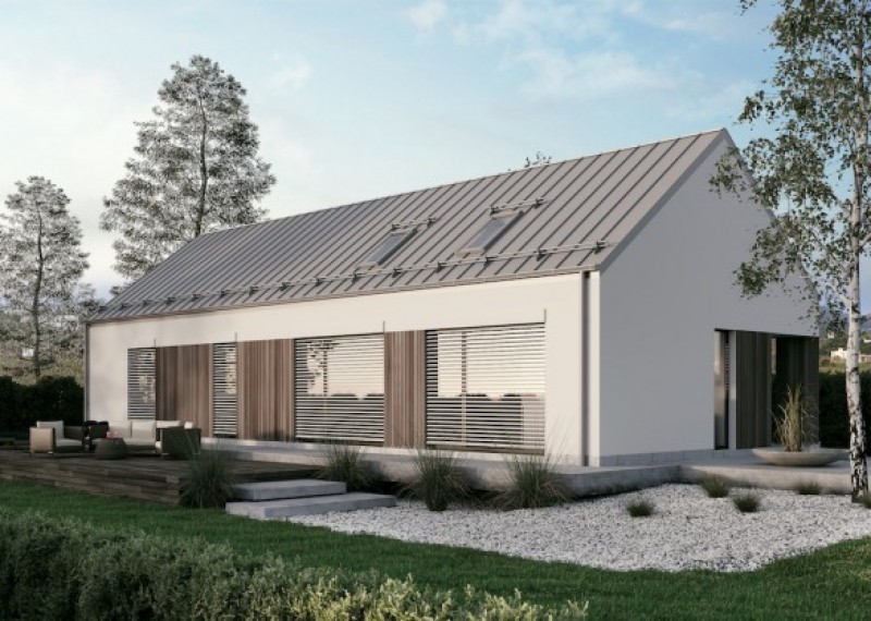 Moderní, praktický 4pokojový bungalov se sedlovou střechou a velkými prosklenými plochami. Použití dřevěného obkladu na části fasády dodává domu atraktivní vzhled. Výhodou domu je možnost umístění i na menší a užší pozemky.
