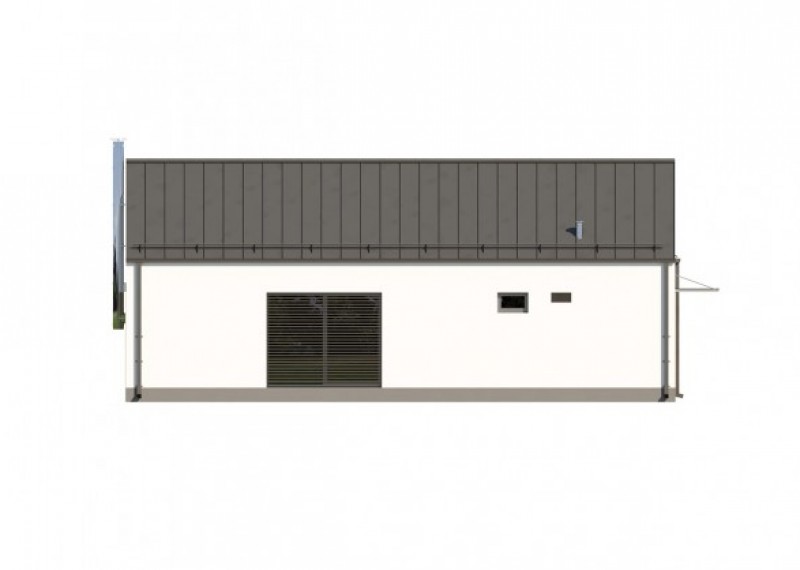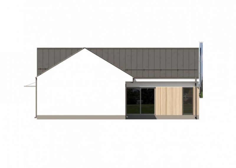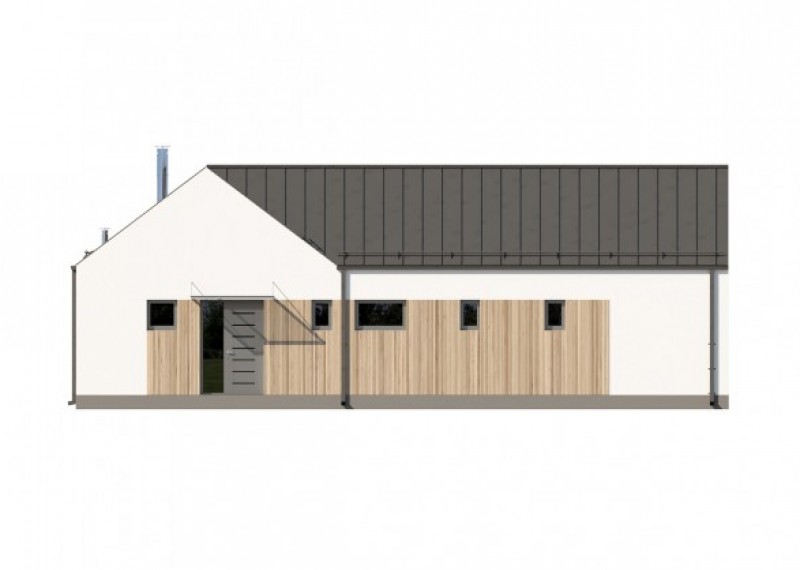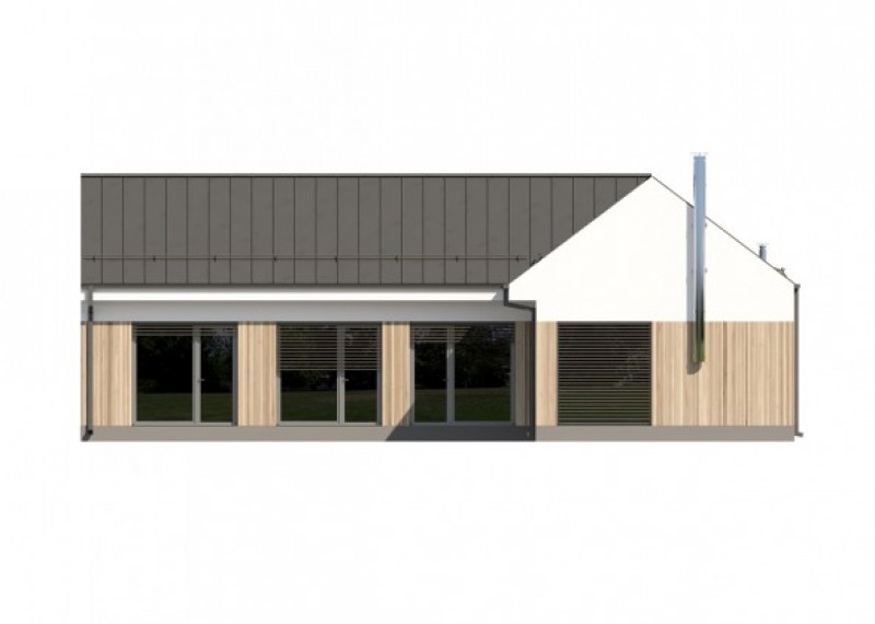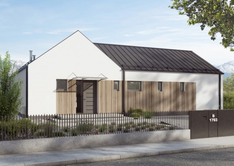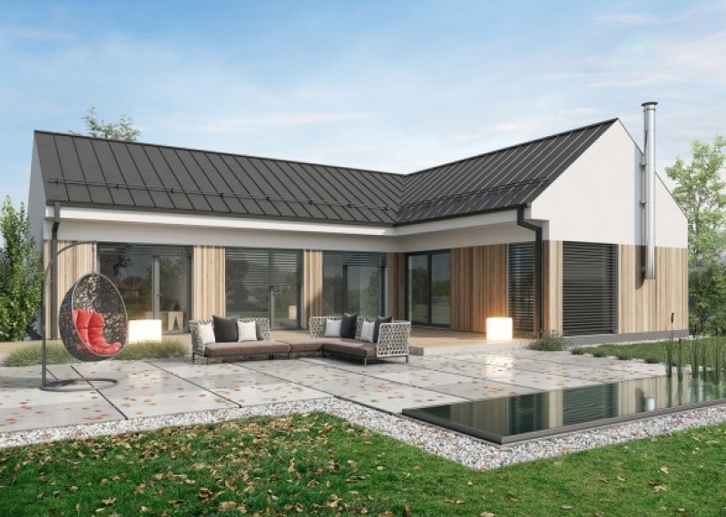 Moderní bungalov se sedlovou střechou na půdorysu ve tvaru L, což umožňuje orientaci všech obytných místností do zahrady a díky francouzským oknům také výstup na terasu. Použití dřevěného obkladu na části fasády dodává domu atraktivní vzhled.