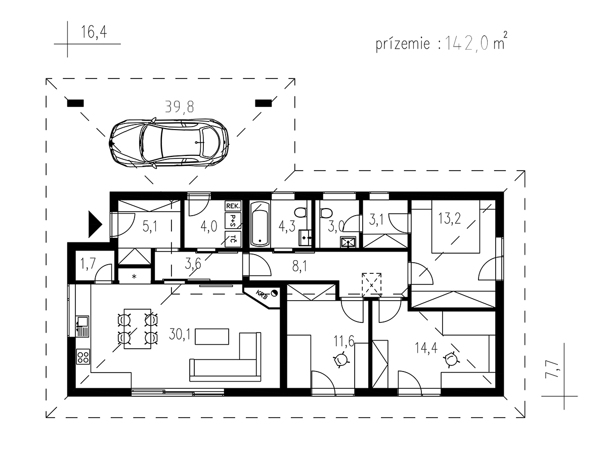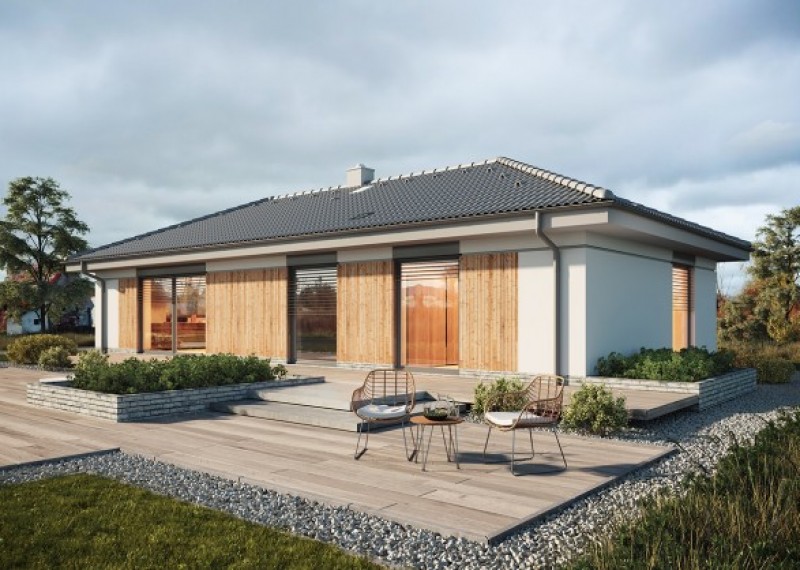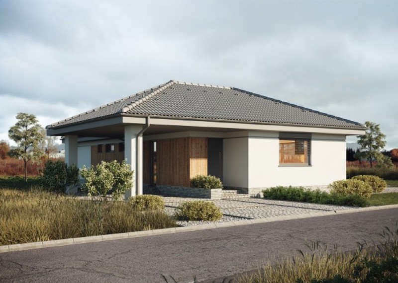 Středně velký rodinný dům typu bungalov tradičního vzhledu. Dům je ideální pro pohodlné bydlení 4členné domácnosti. Součástí domu je zastřešené parkovací stání.