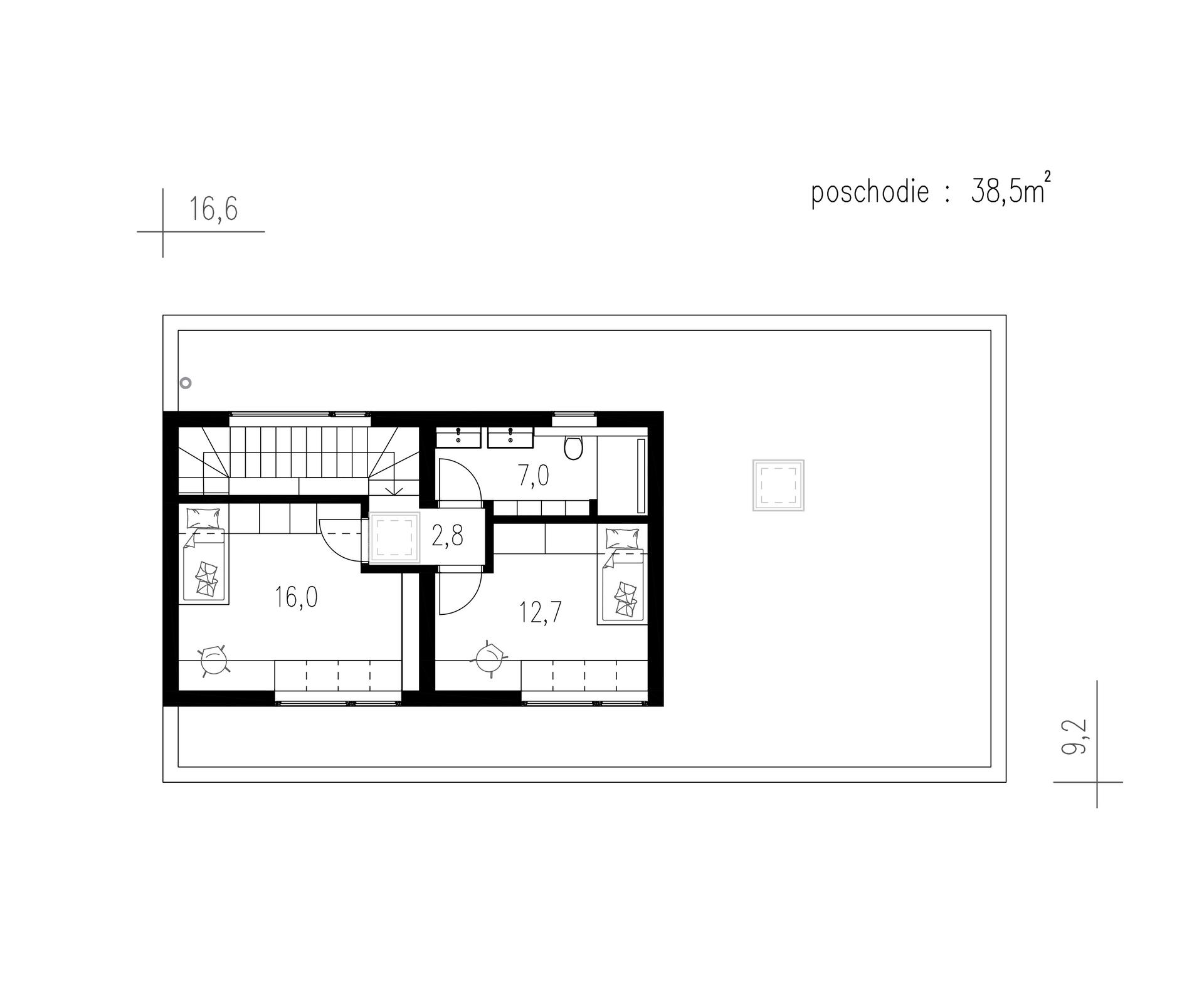 V horním podlaží jsou umístěny 2 ložnice a velká koupelna.