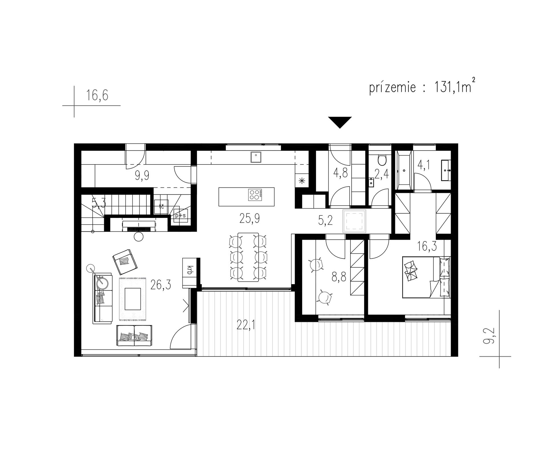 V přízemí se nachází obytný velkoprostor, kde je kuchyně s jídelnou opticky oddělená od obývacího prostoru. V kuchyni nechybí nadstandardně velký sklad potravin. Velké prosklené plochy zajišťují nejen dostatek denního světla v interiéru, ale také přirozené propojení s terasou a ničím nerušený výhled do zahrady.