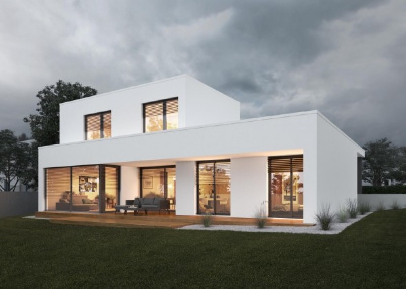 Moderní, dvoupodlažní rodinný dům s plochou střechou a čistými, elegantními liniemi.