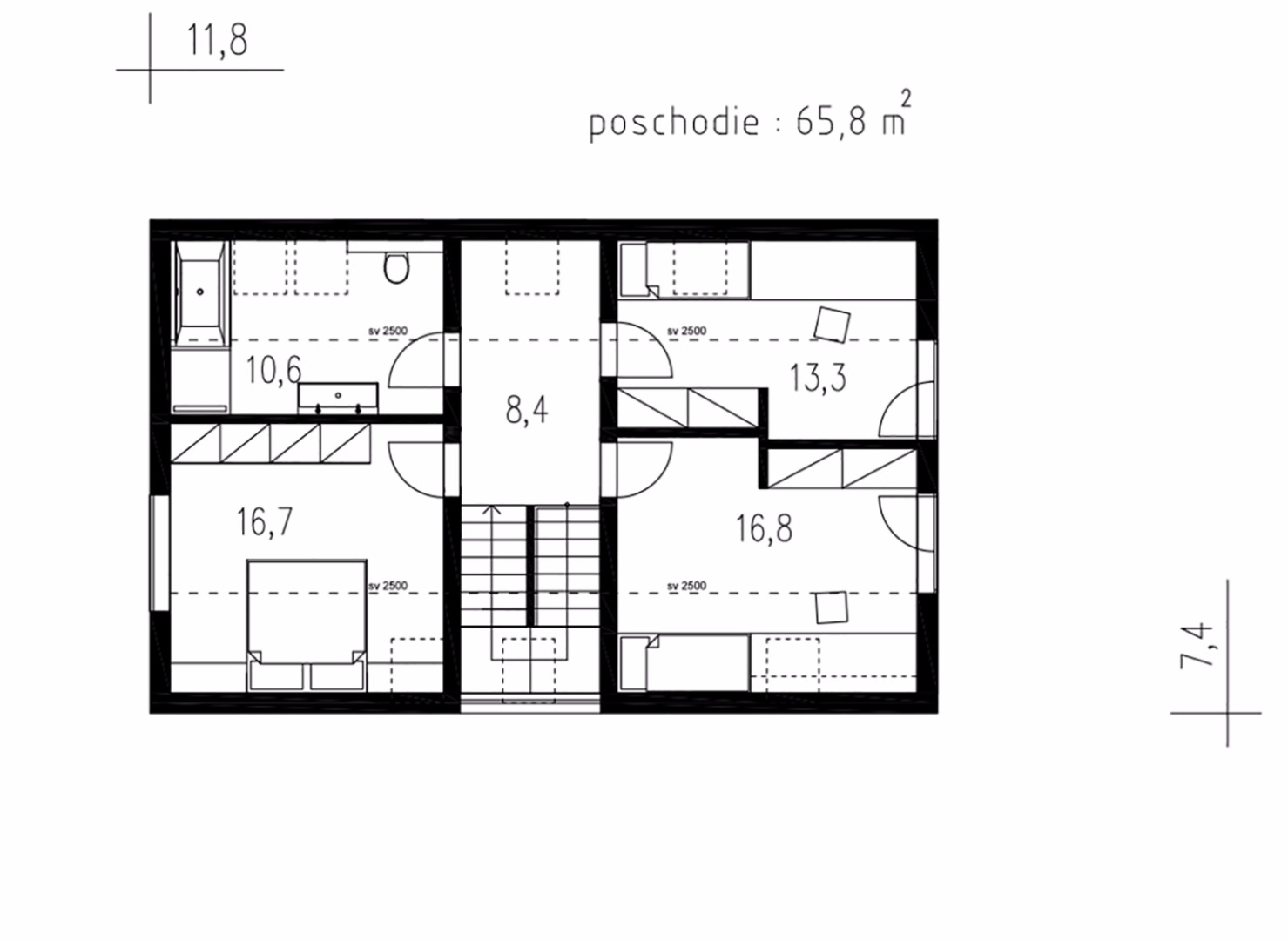 V podkroví jsou umístěny 3 pohodlné ložnice a nadstandardně velká koupelna s vanou i sprchovým koutem.