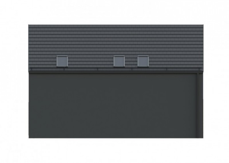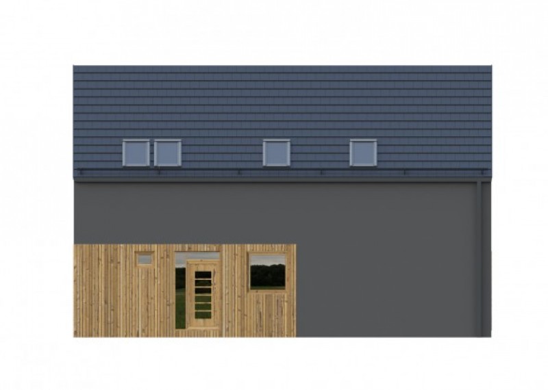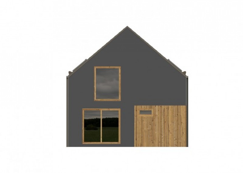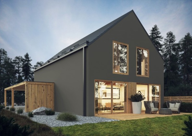 Moderní, jednoduchý rodinný dům se sedlovou střechou a obytným podkrovím. Použití dřevěného obkladu na části fasády dodává domu atraktivní vzhled.