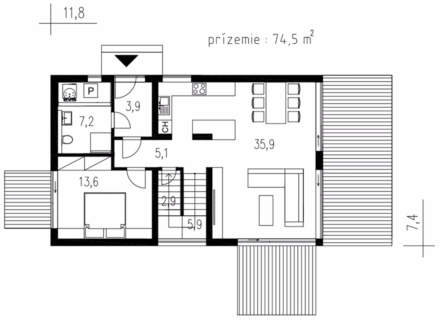 V přízemí se nachází velkorysý obývací prostor propojený s jídelnou a kuchyňským koutem. Pro pohodlné skladování potravin je zde navržena spíž. Velké prosklené plochy francouzských oken zajišťují nejen dostatek denního světla v interiéru, ale také přirozené propojení s terasou a ničím nerušený výhled do zahrady.