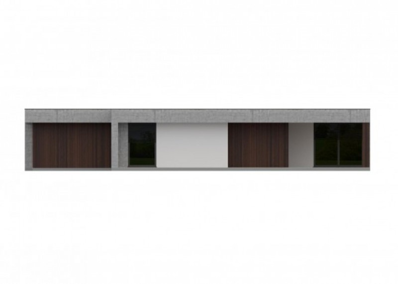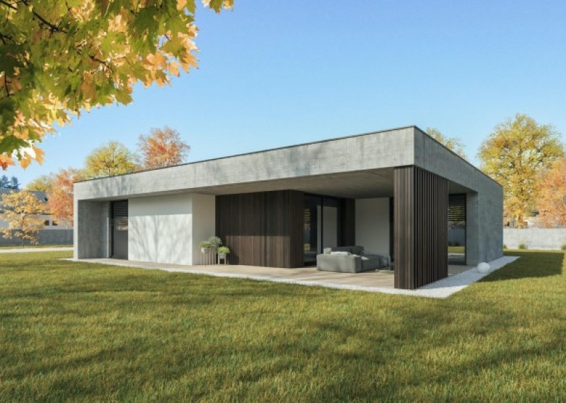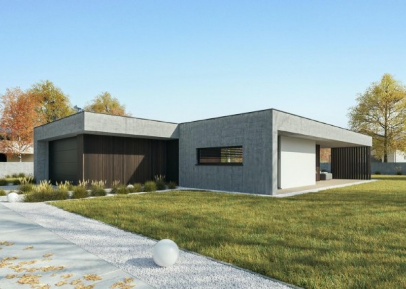 Moderní a nadčasový bungalov s plochou střechou a praktickým přesahem střechy, který vytváří krytou terasu. Součástí domu je dvojgaráž.