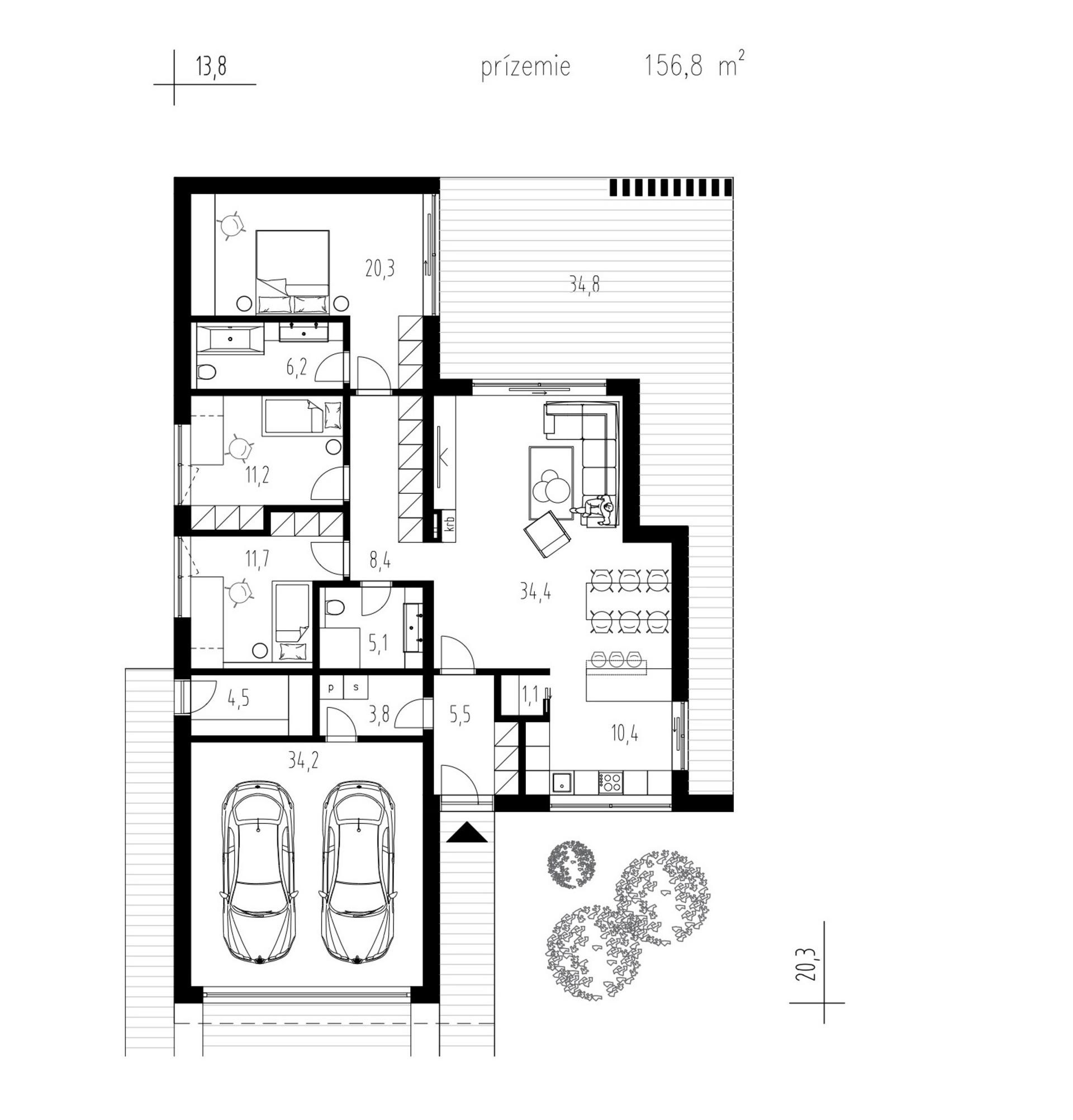 Srdcem domu je obytný velkoprostor s krbem, propojený s jídelnou a kuchyňským koutem. Velké prosklené plochy zajišťují dokonalé prosvětlení interiéru a přirozené propojení s terasou. V kuchyni nechybí praktická spíž pro pohodlné skladování potravin.