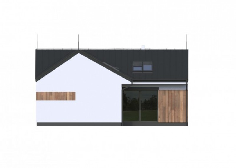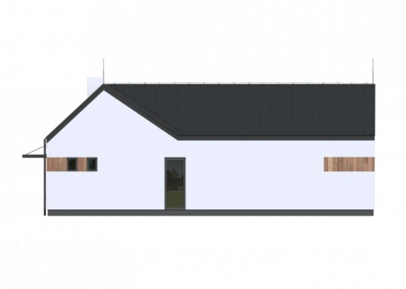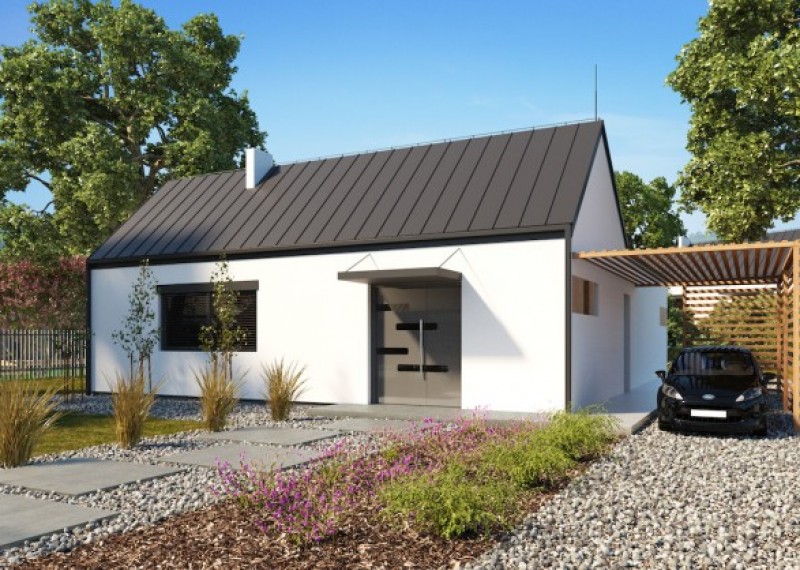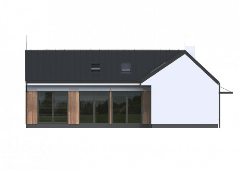 Praktický bungalov se sedlovou střechou na půdorysu ve tvaru L, což umožňuje orientaci všech obytných místností do zahrady a díky francouzským oknům také výstup na terasu. Použití dřevěného obkladu na části fasády dodává domu atraktivní vzhled. Dům je ideální pro pohodlné bydlení 4členné rodiny.