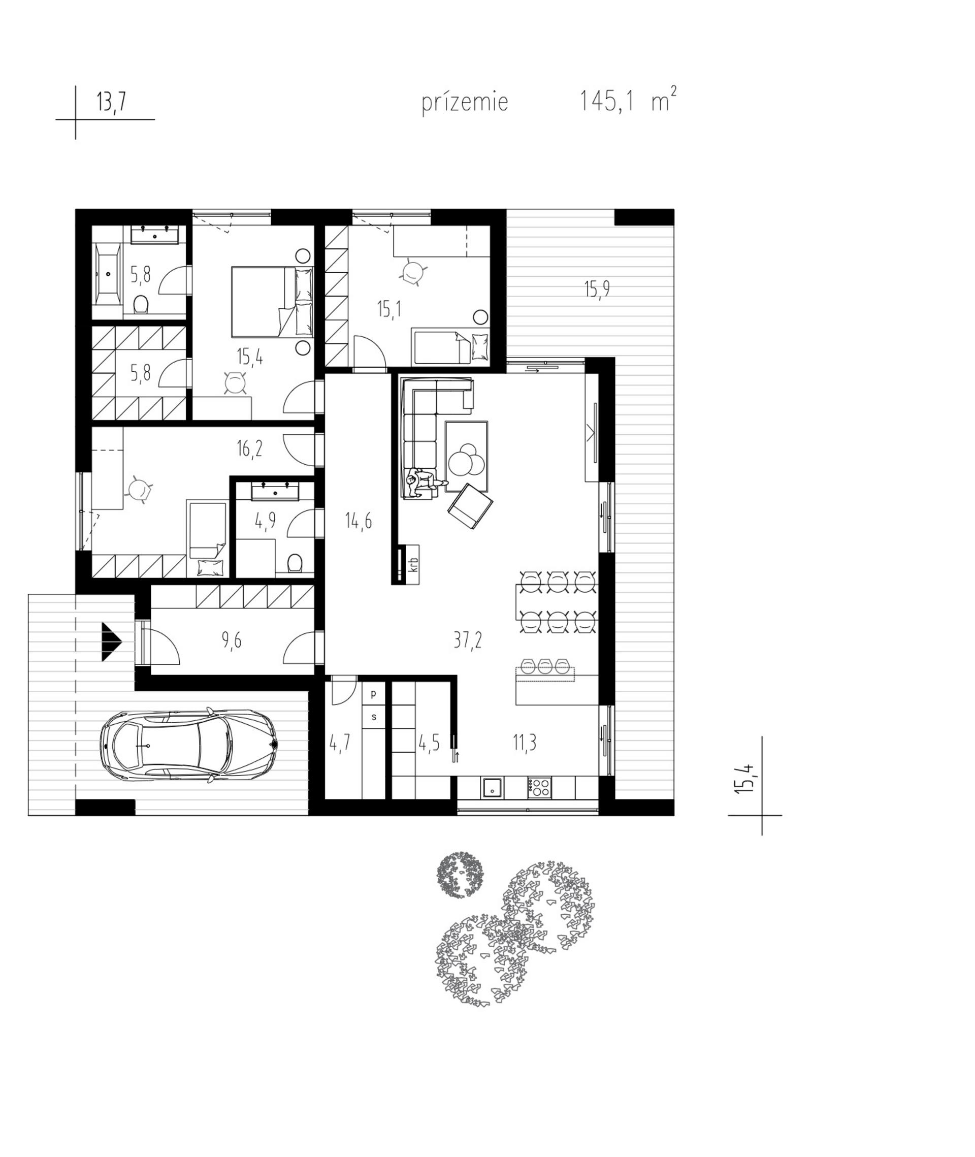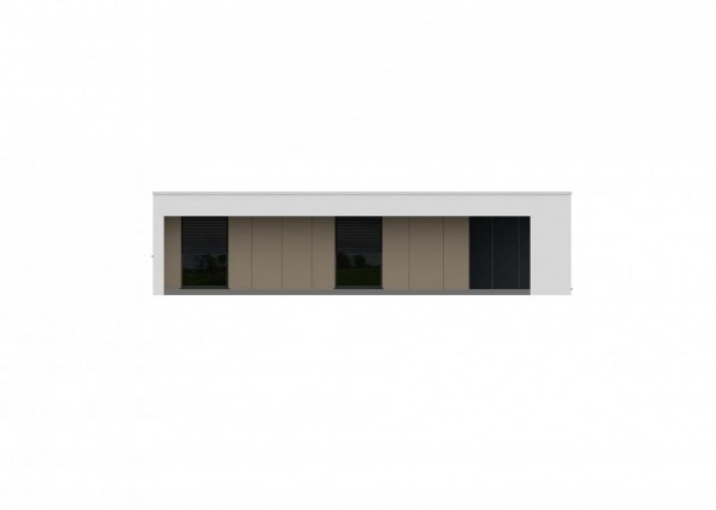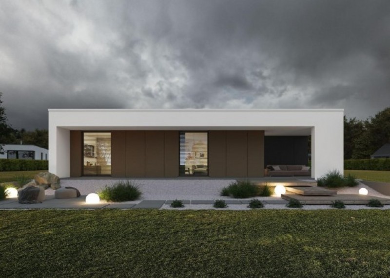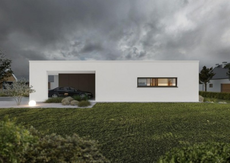 Moderní, elegantní bungalov s čistými liniemi, ideální pro pohodlné bydlení 4členné rodiny. Zajímavým a zároveň praktickým prvkem je překrytí vstupu a terasy přesahem střechy.