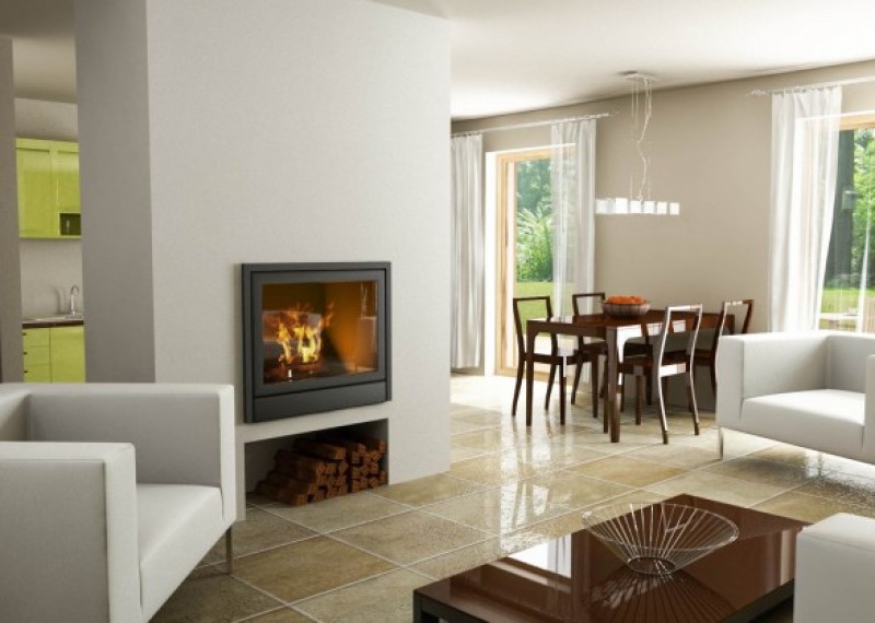Dům je členěn na společenskou a privátní část. Společenská je tvořena velkorysým obývacím prostorem s centrálně umístěným krbem, který opticky odděluje kuchyňský kout. Velká francouzská okna zajišťují dostatek světla v interiéru a přirozené propojení s terasou.