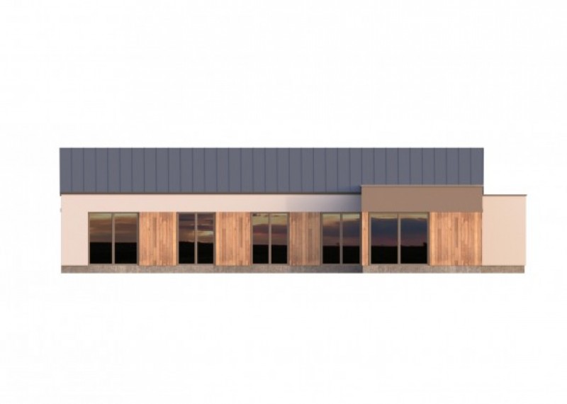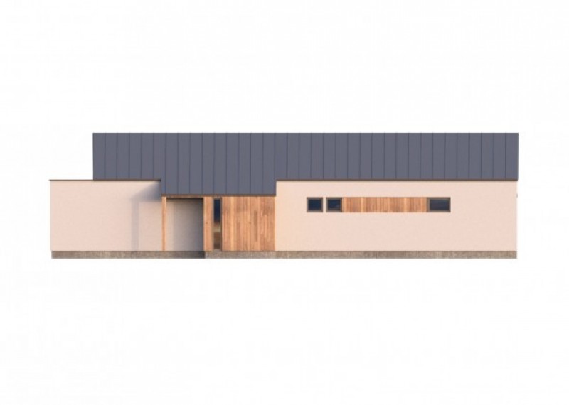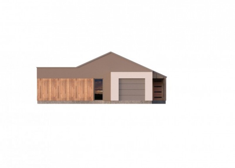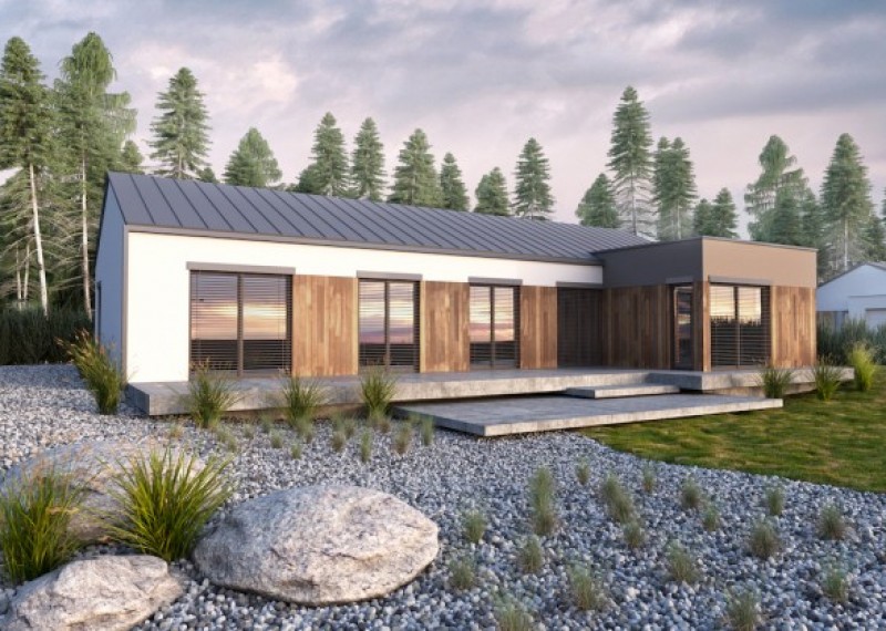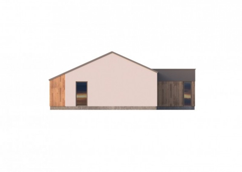 Moderní, nadčasový bungalov s garáží a kombinací rovné a sedlové střechy. Půdorys domu ve tvaru L umožňuje orientaci všech obytných místností do zahrady a díky francouzským oknům také výstup na terasu. Použití dřevěného obkladu na části fasády dodává domu atraktivní vzhled.