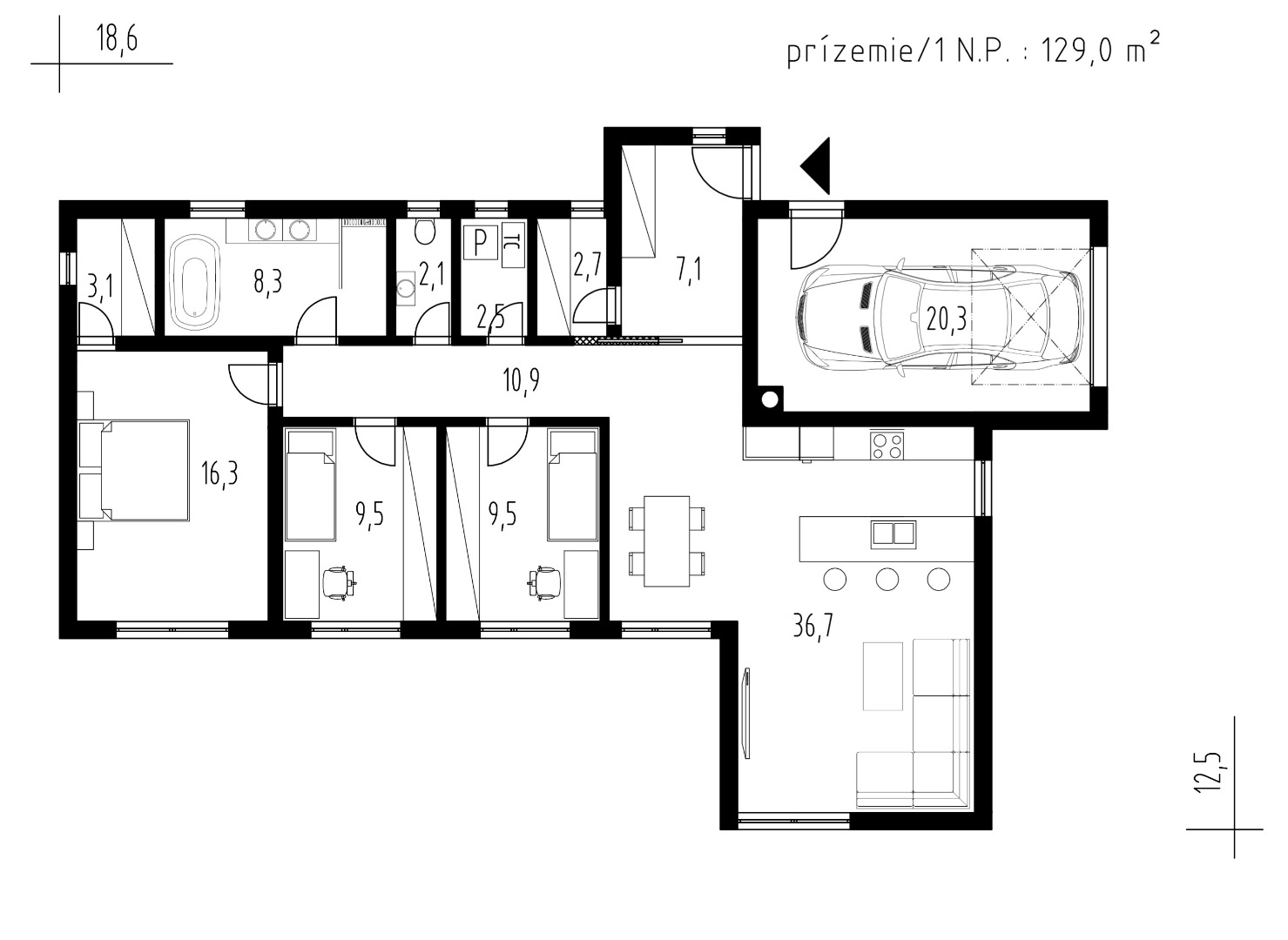 Srdcem domu je velkorysý obytný prostor, propojený s jídelnou a kuchyňským koutem. Velké prosklené plochy zajišťují dostatek světla v interiéru a ničím nerušený výhled do zahrady.