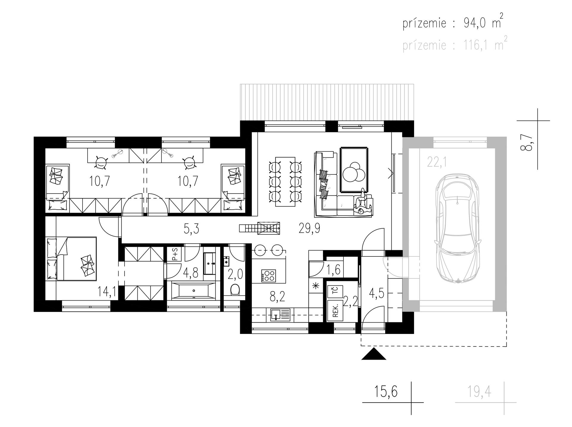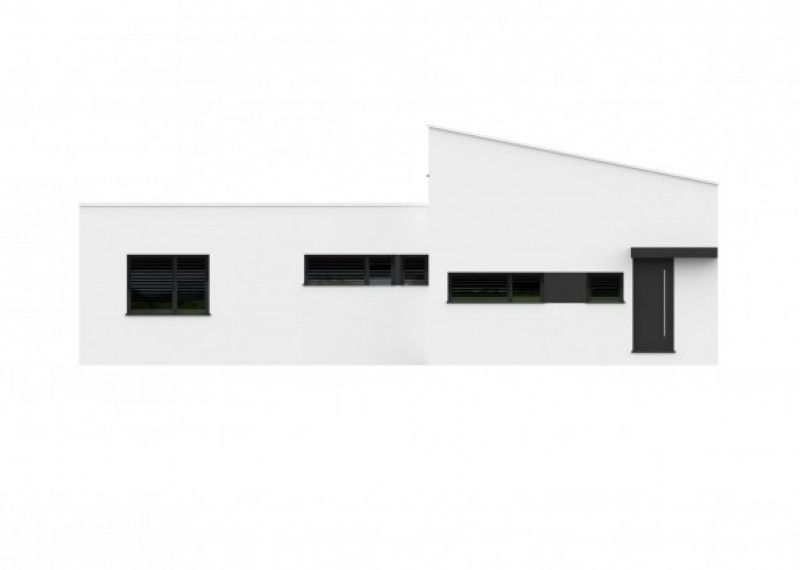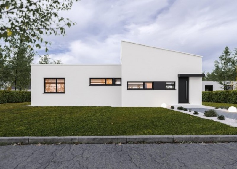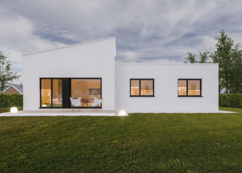 Jednoduchý, nadčasový bungalov s kombinací ploché a pultové střechy, charakteristický čistými, elegantními liniemii.