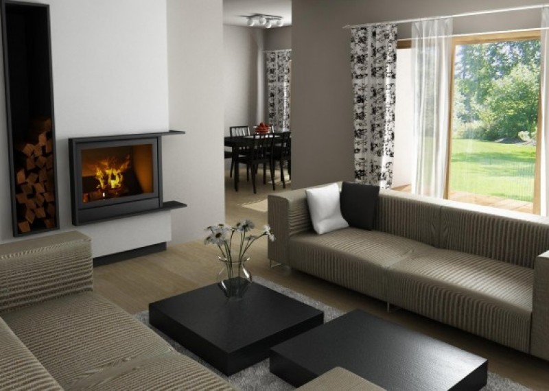 Dům je členěn na společenskou a privátní část, které jsou vzájemně odděleny. Společenská je tvořena velkorysým obývacím prostorem, který je opticky oddělen od kuchyně a jídelny. Pro vytvoření útulné atmosféry zejména v zimních měsících je zde navržen krb. V kuchyni je umístěn praktický sklad potravin.