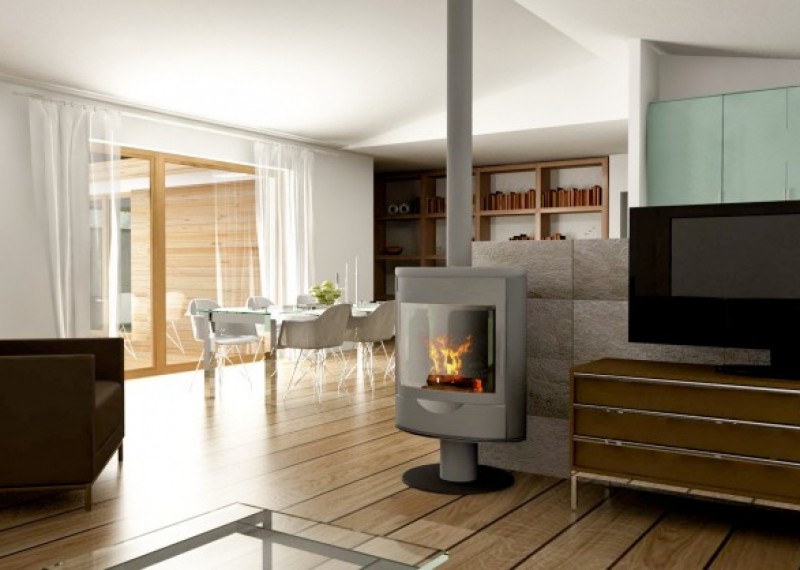 Srdcem domu je velkorysý obytný prostor, propojený s jídelnou a kuchyňským koutem. Podhled je zde zvýšený až ke krovu, což společně s velkými prosklenými plochami vytváří pocit vzdušnosti. Pro vytvoření útulné atmosféry je zde navržen krb.