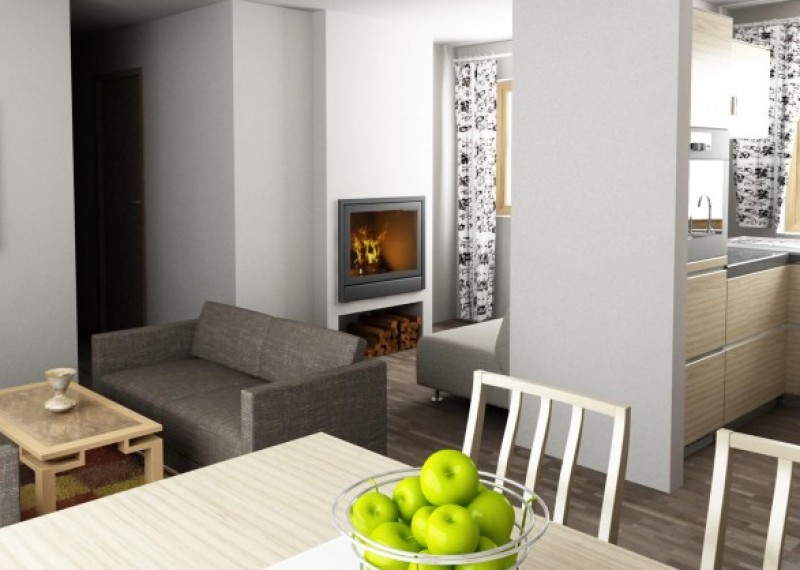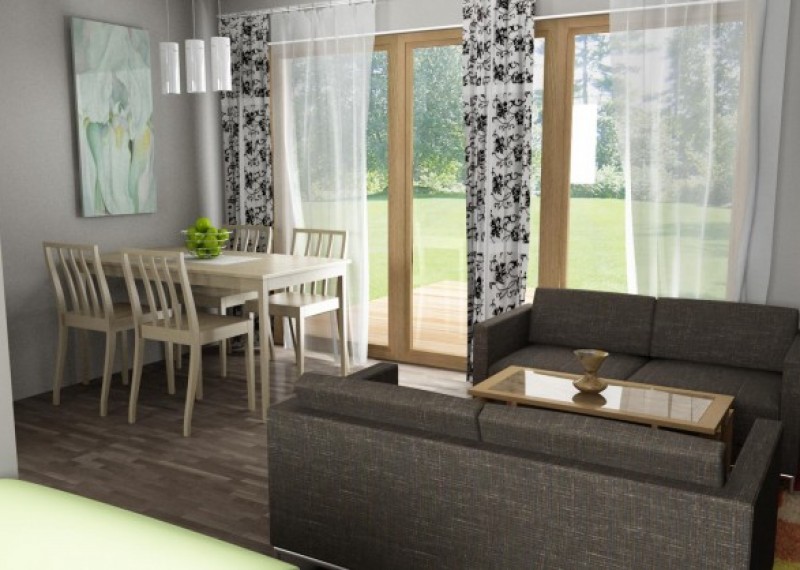 Obývací prostor je propojený s jídelnou, kuchyňský kout je částečně oddělen. Je zde navrženo i útulné posezení u krbu. Francouzské okno zajišťuje dostatečné prosvětlení interiéru i jeho přirozené propojení s terasou.