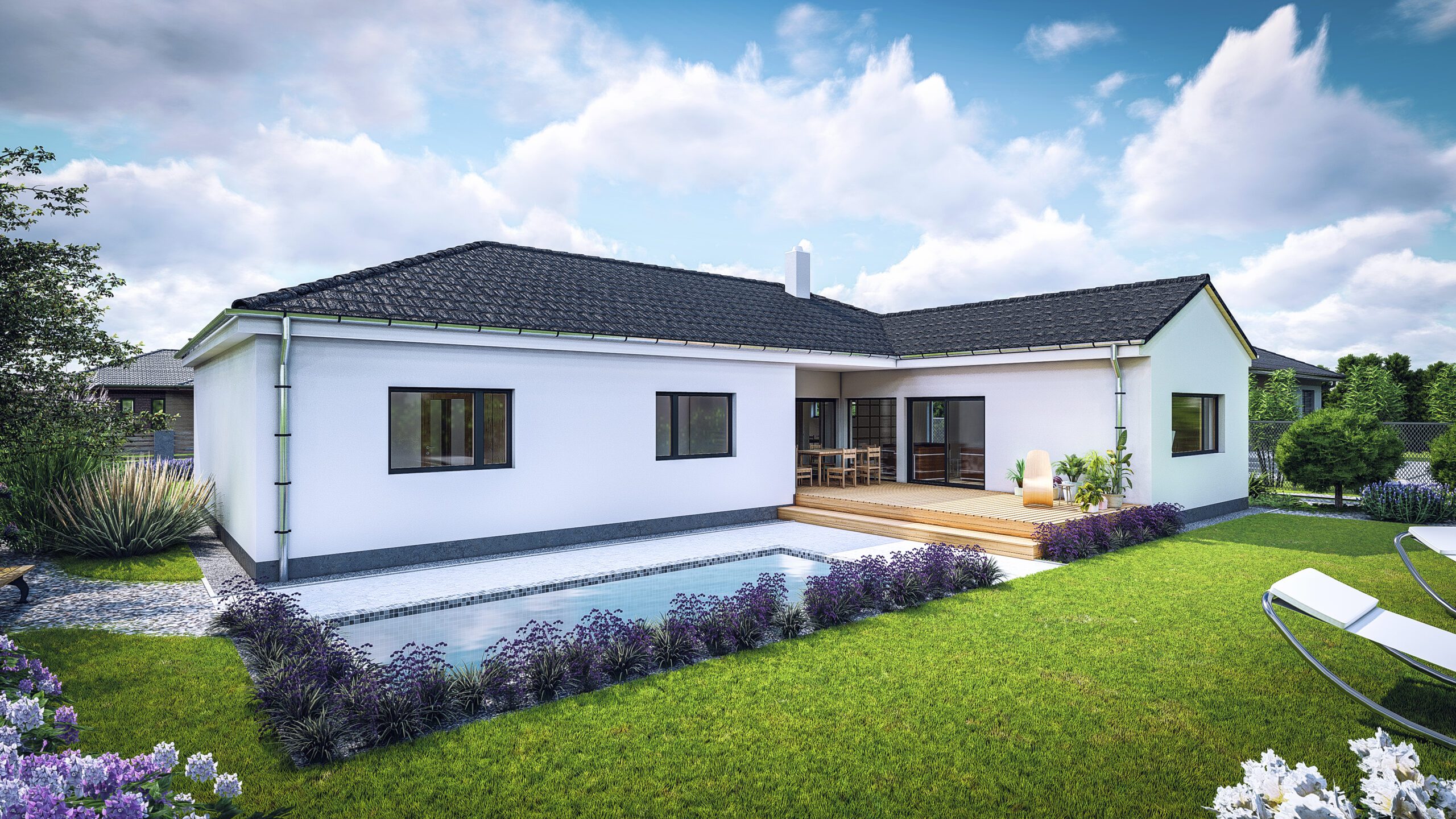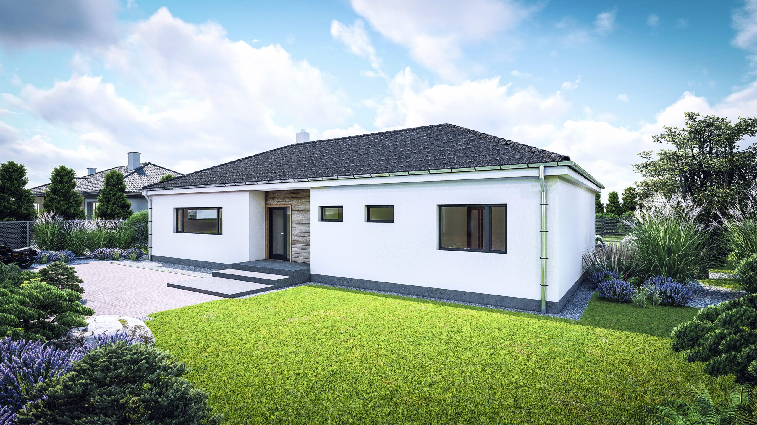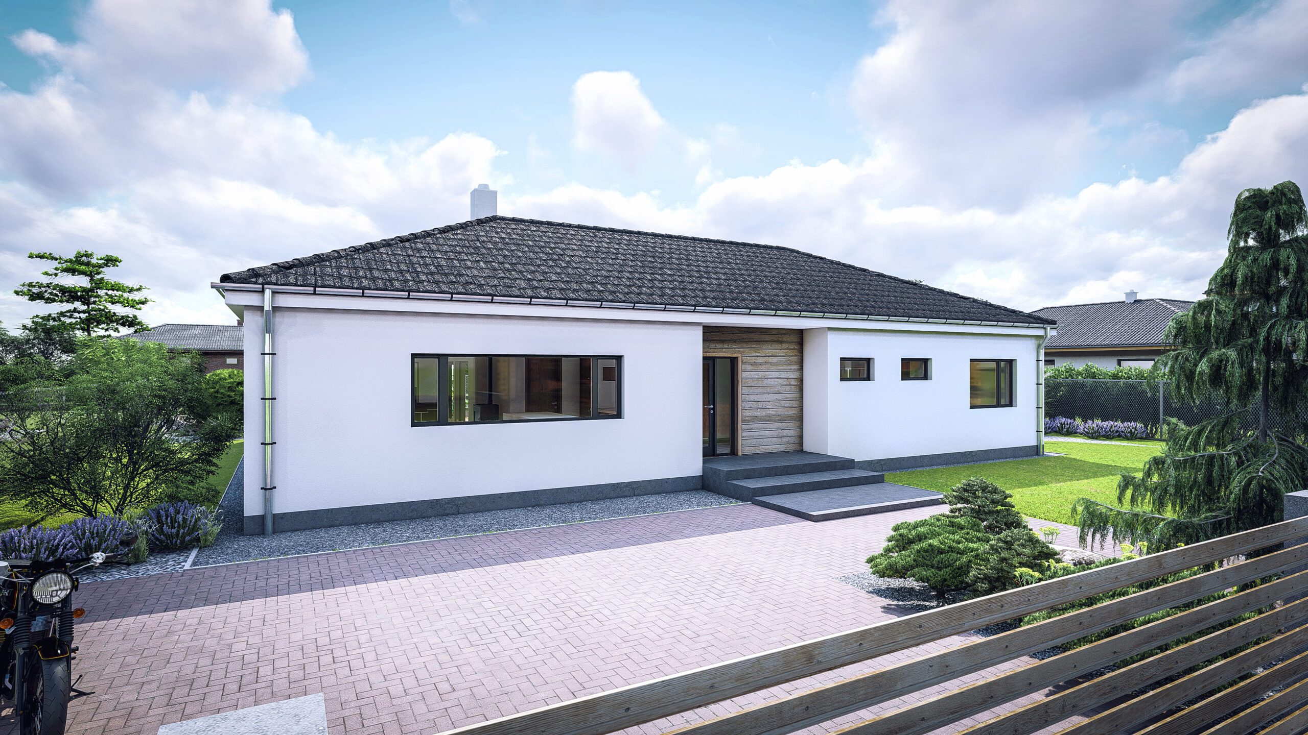 Praktický, prostorný bungalov na půdorysu ve tvaru L, což zajišťuje pocit soukromí na terase, která je navíc překryta přesahem střechy. Dům je ideální pro pohodlné bydlení 5členné rodiny.