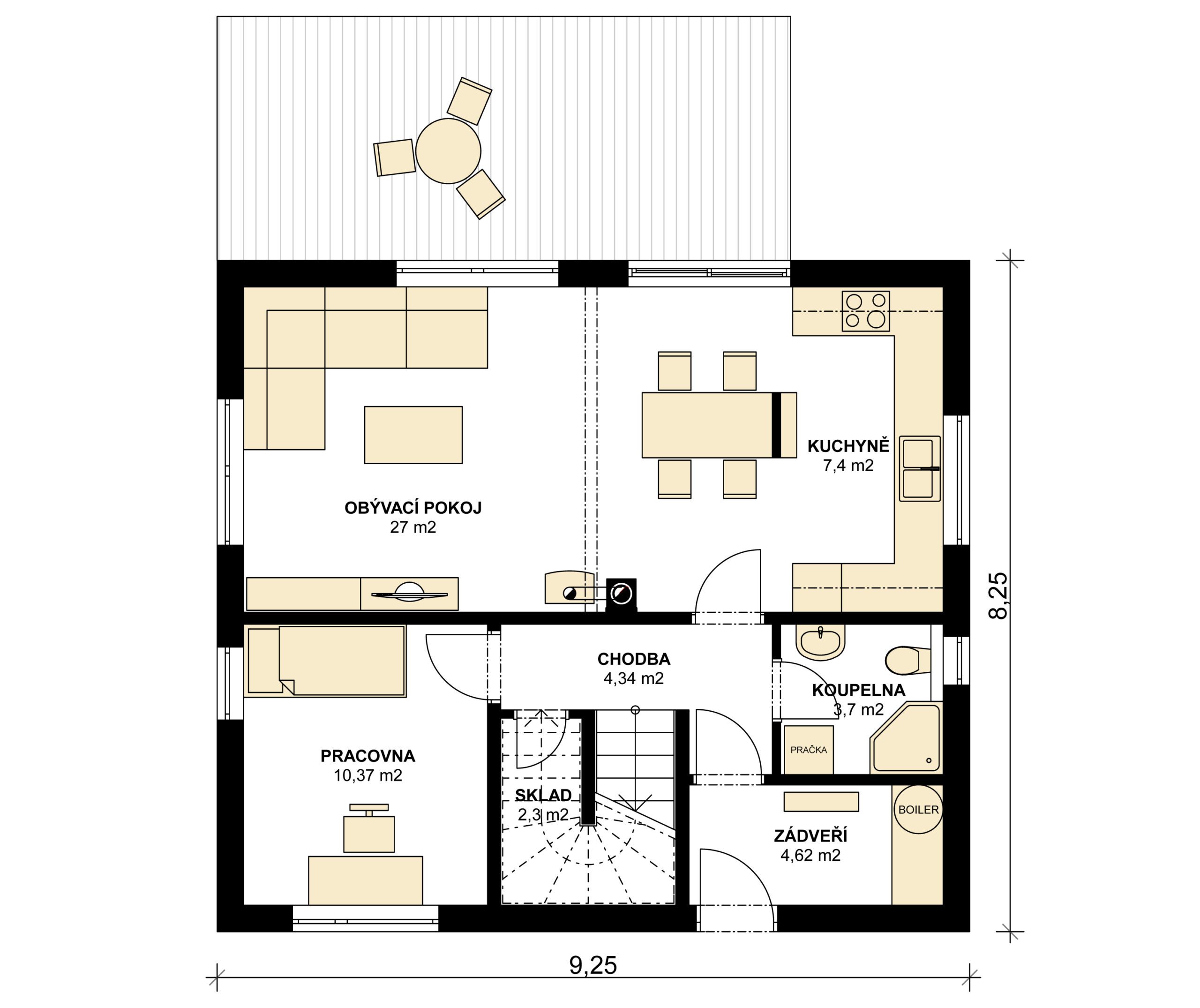 Společenská část domu je umístěna v přízemí a je tvořena velkorysým obytným prostorem, propojeným s jídelnou a kuchyňským koutem. Centrálně umístěný krb jistě oceníte zejména v zimních měsících. Velké prosklené plochy jsou zárukou dostatečného prosvětlení interiéru denním světlem a ničím nerušeného výhledu do zahrady. V prostoru pod schodištěm je navržen praktický skladovací prostor.