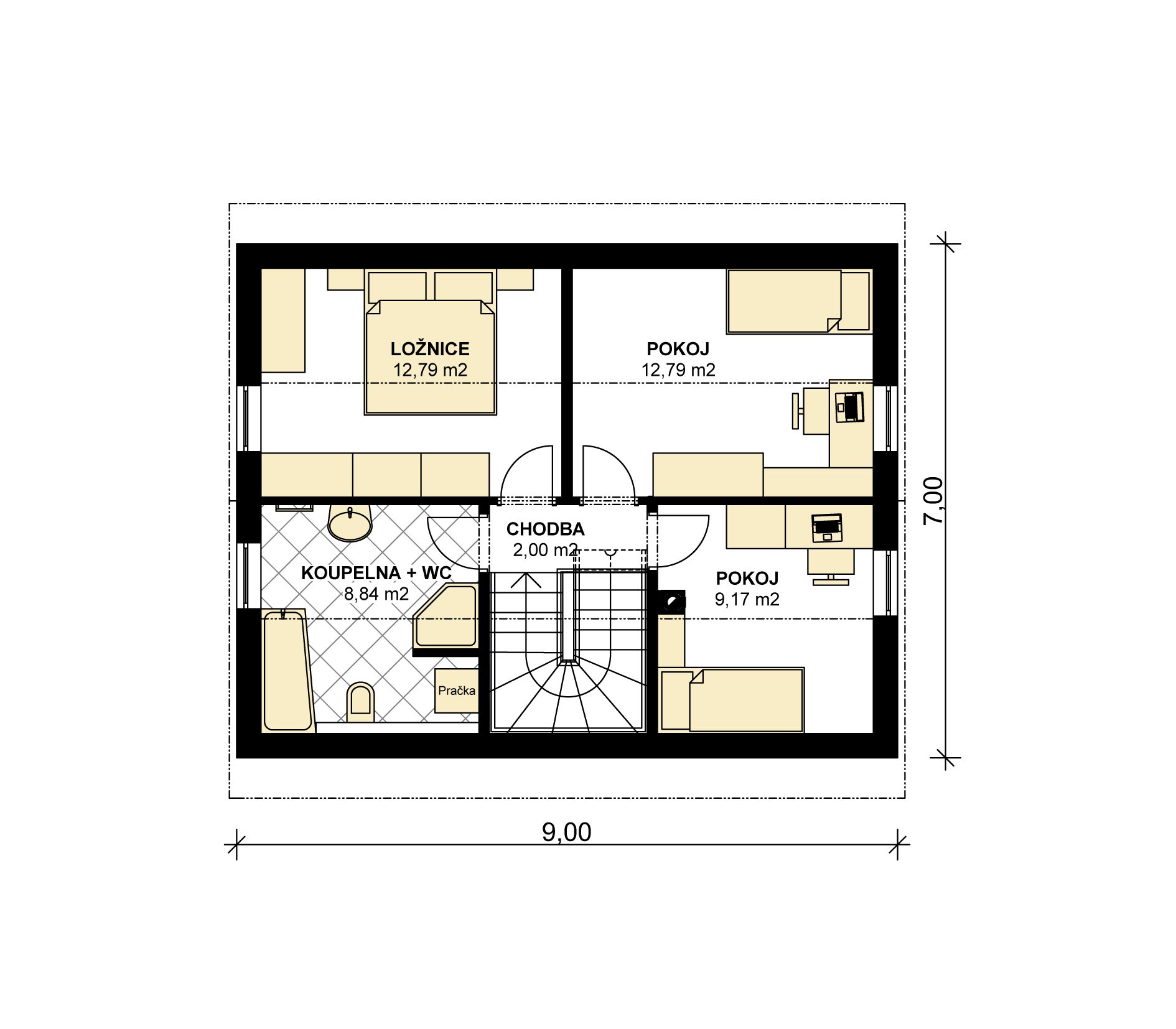 Klasický 4pokojový rodinný dům s obytným podkrovím. Díky malé zastavěné ploše je vhodný na menší parcely.