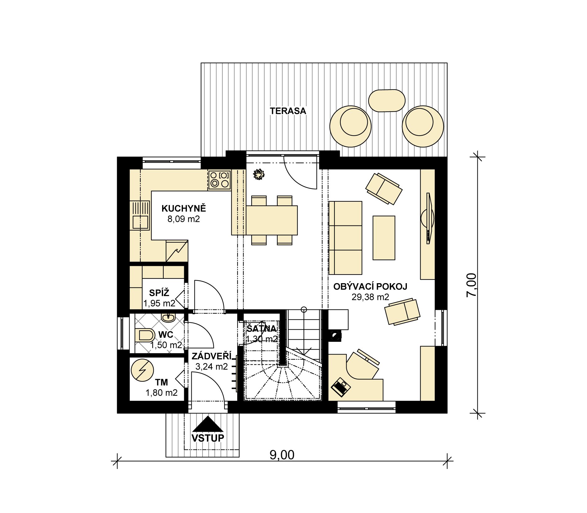 V přízemí domu se nachází obývací pokoj s krbem, který je propojen s jídelnou a kuchyňským koutem a díky francouzkému oknu také s exteriérem domu. Z části obývacího pokoje lze vytvořit opticky oddělenou pracovnu. Velkou výhodou kuchyně je samostatná spíž, sloužící k pohodlnému uskladnění potravin. Dále v přízemí najdeme samostatné WC a technickou místnost. V prostoru pod schodištěm je navržena šatna.