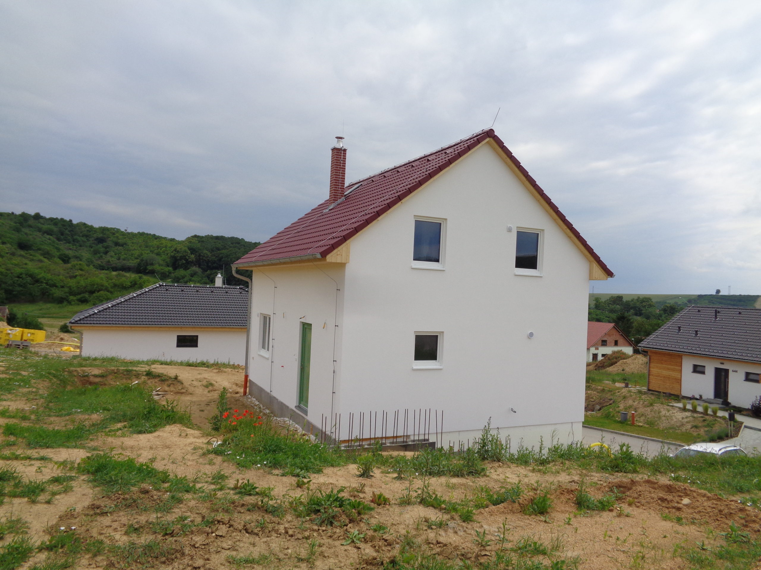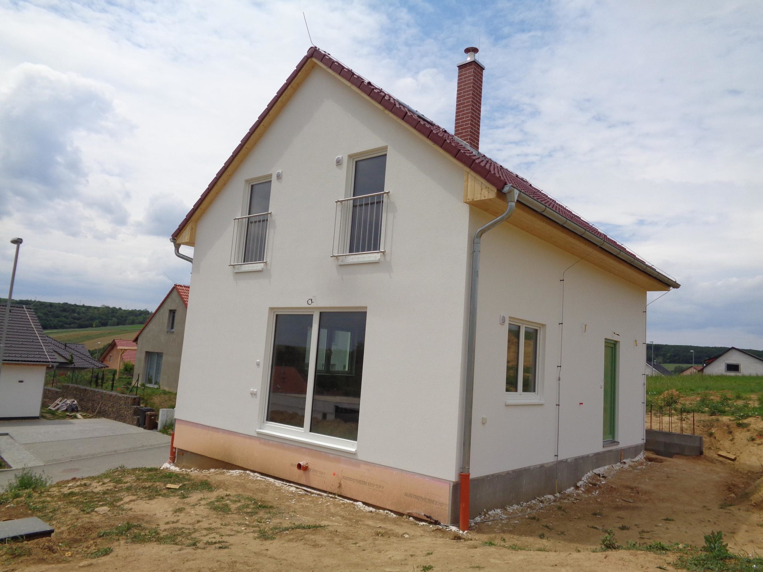 Dům k dokončení neobsahuje finální povrchy podlah a stěn (obklady, dlažby, podlahové krytiny, výmalba), zařizovací předměty koupelen a wc, interiérové dveře a zárubně.