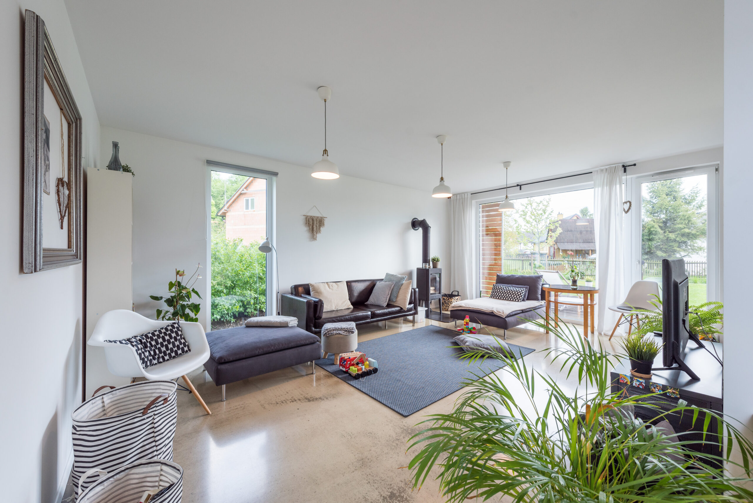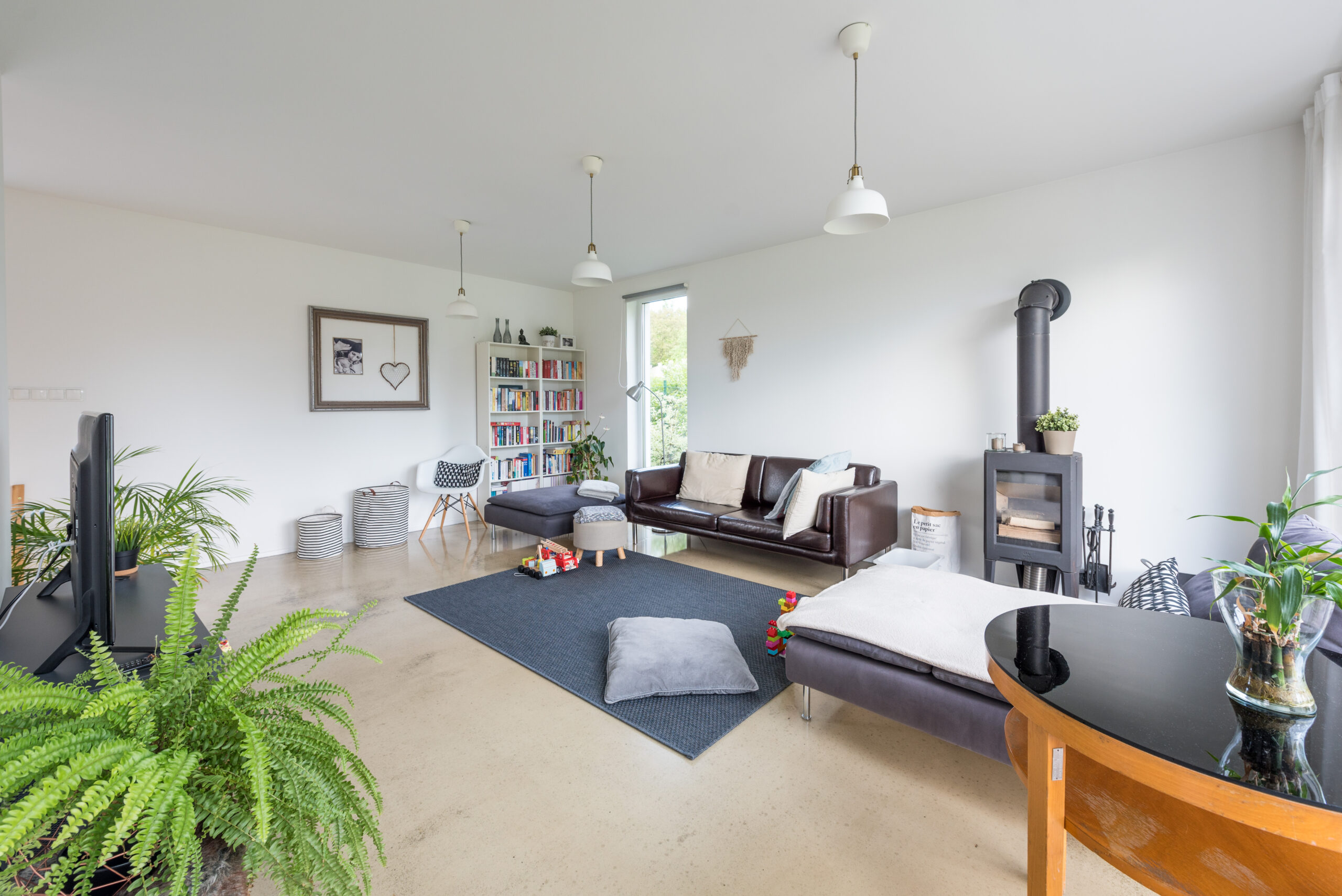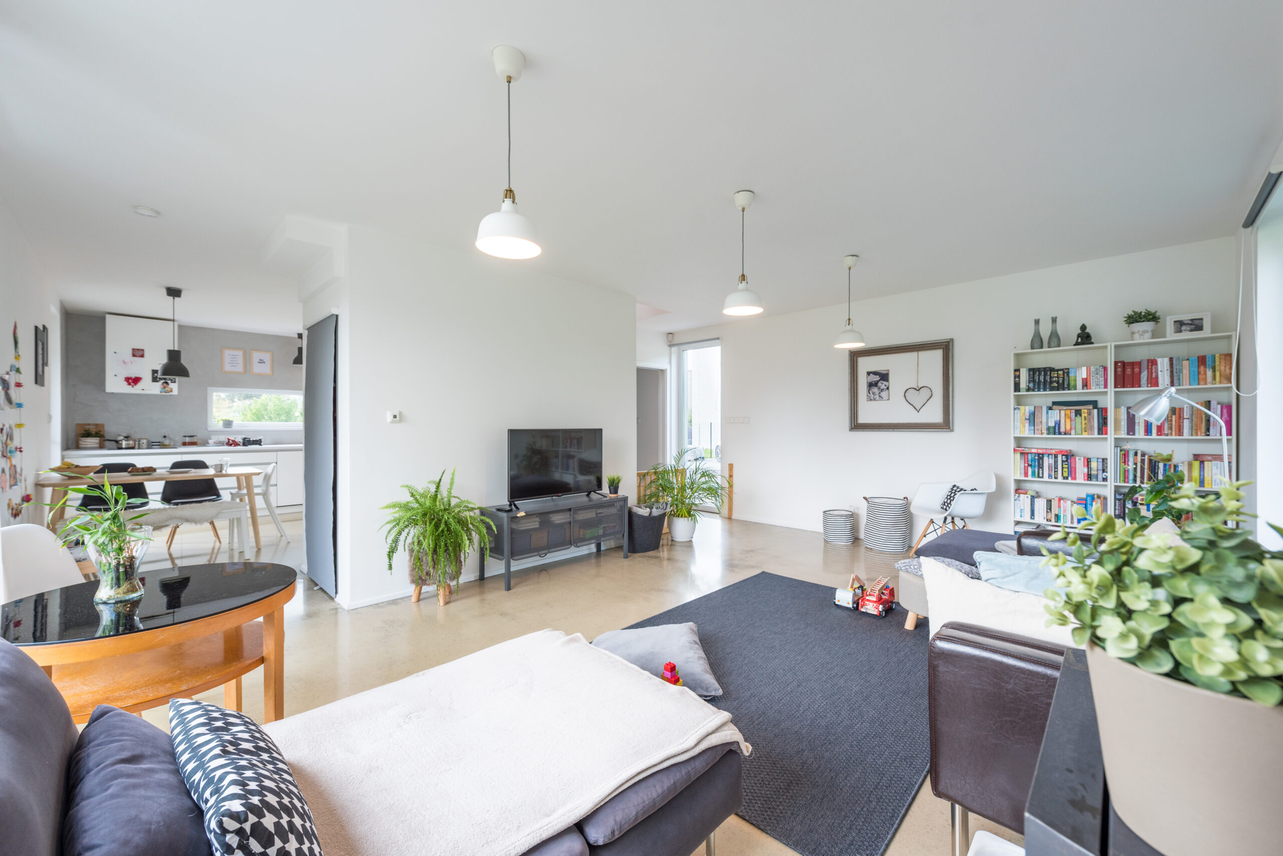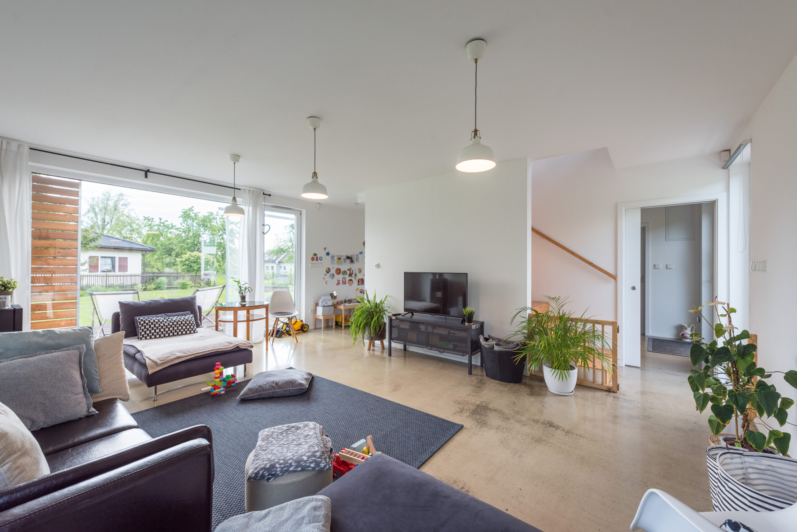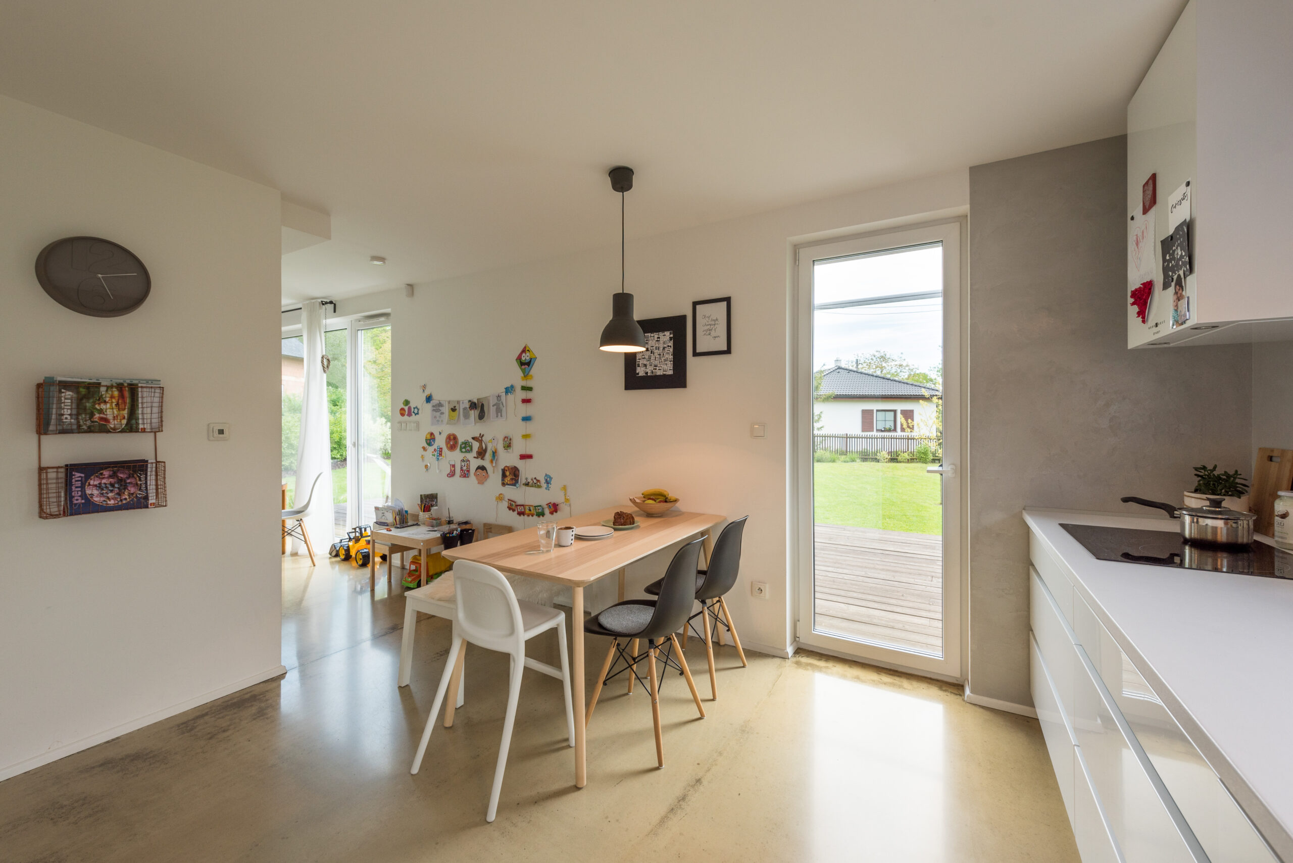 Dům k dokončení neobsahuje finální povrchy podlah a stěn (obklady, dlažby, podlahové krytiny, výmalba), zařizovací předměty koupelen a wc, interiérové dveře a zárubně.