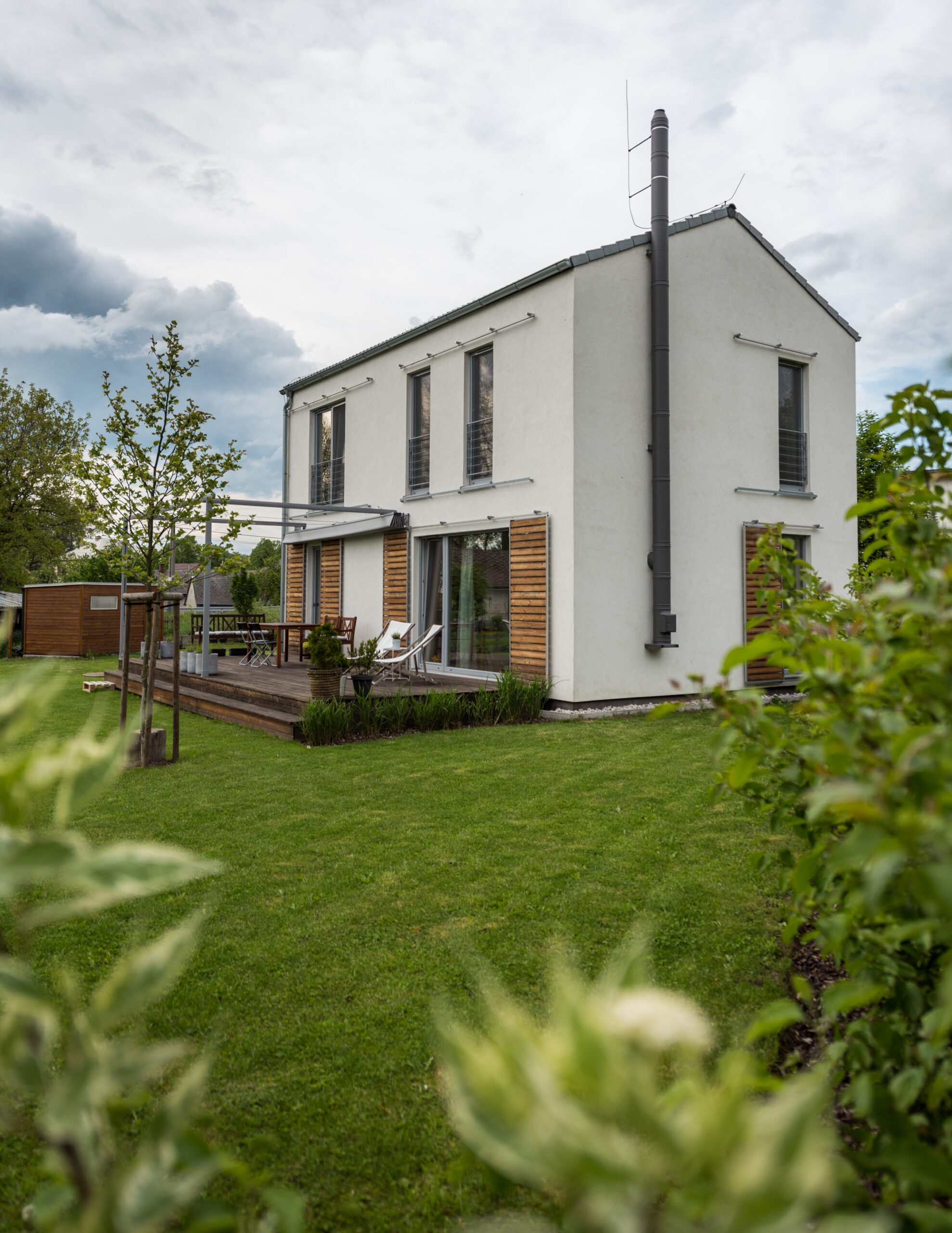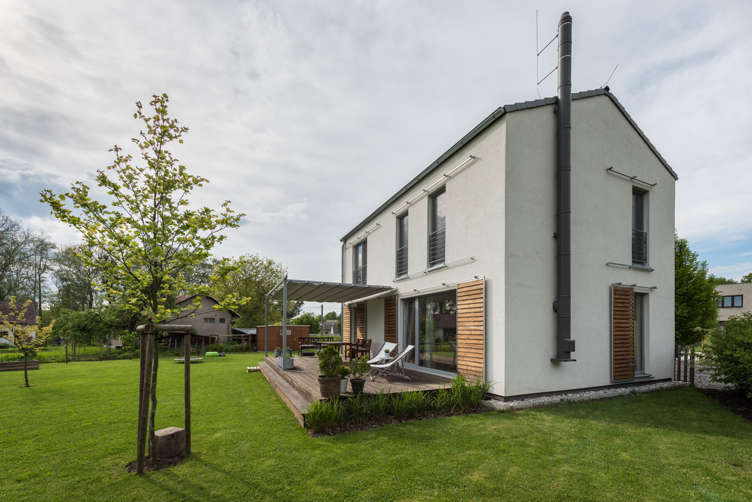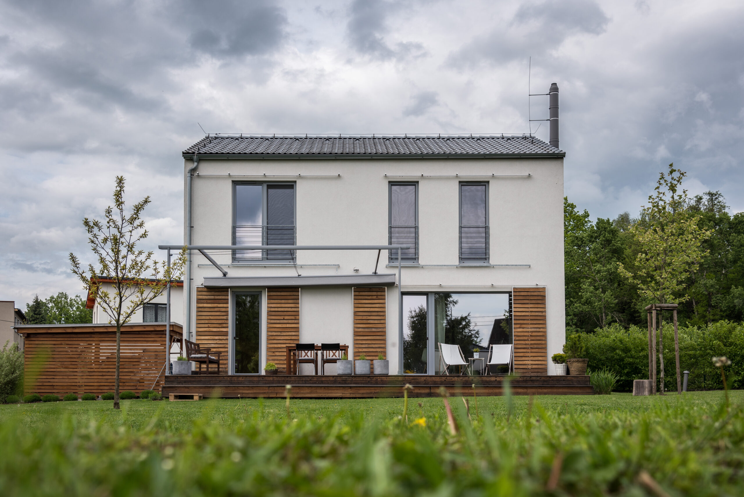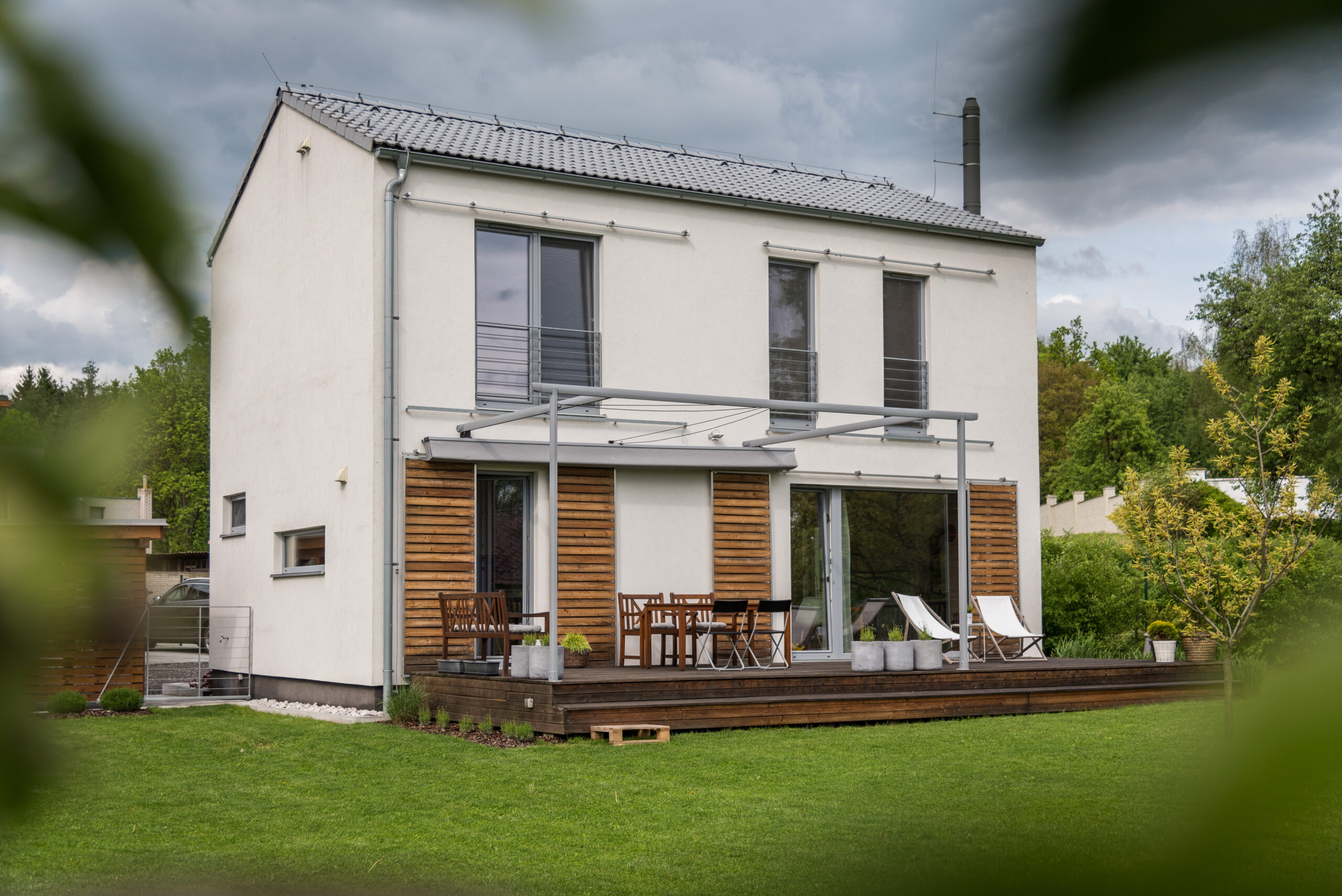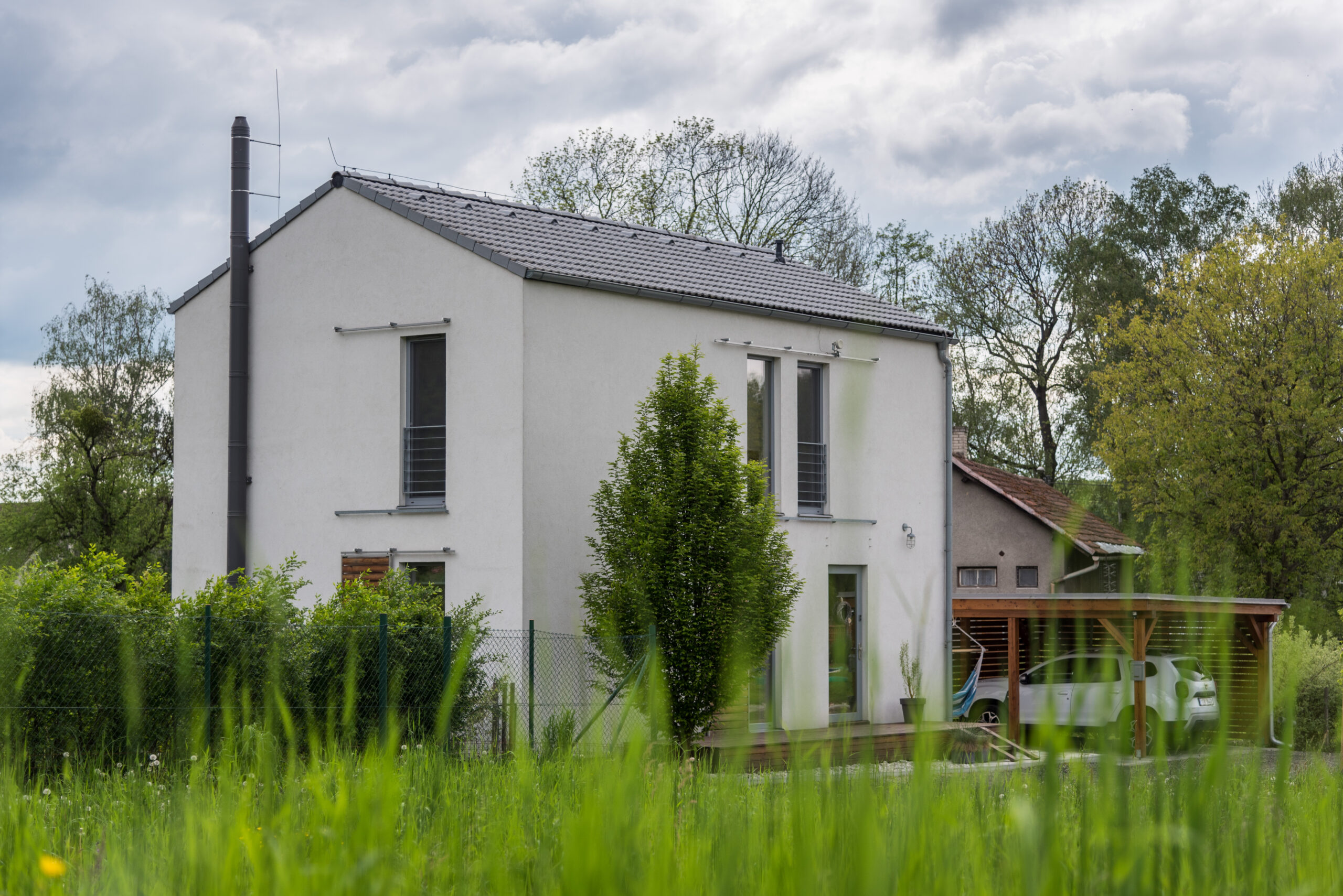 Dům je zhotoven z předem připravených celostěnových panelů certifikovaného systému pro dřevostavby DMK system.