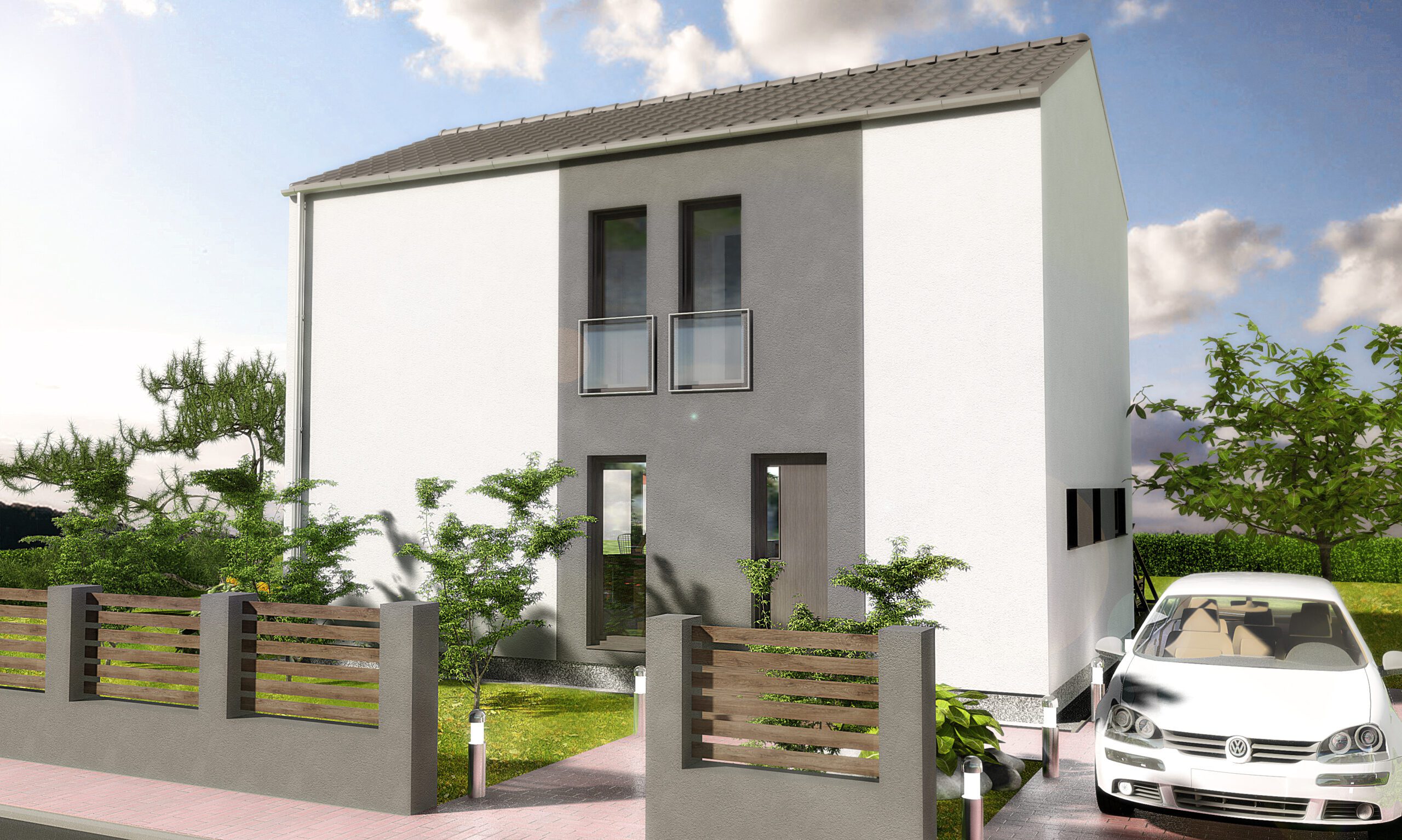 Moderní patrový dům s plnou výškou patra a malou zastavěnou plochou, díky níž se hodí i na menší pozemek. Poutavým architektonickým prvkem jsou francouzská okna ve všech místnostech.
