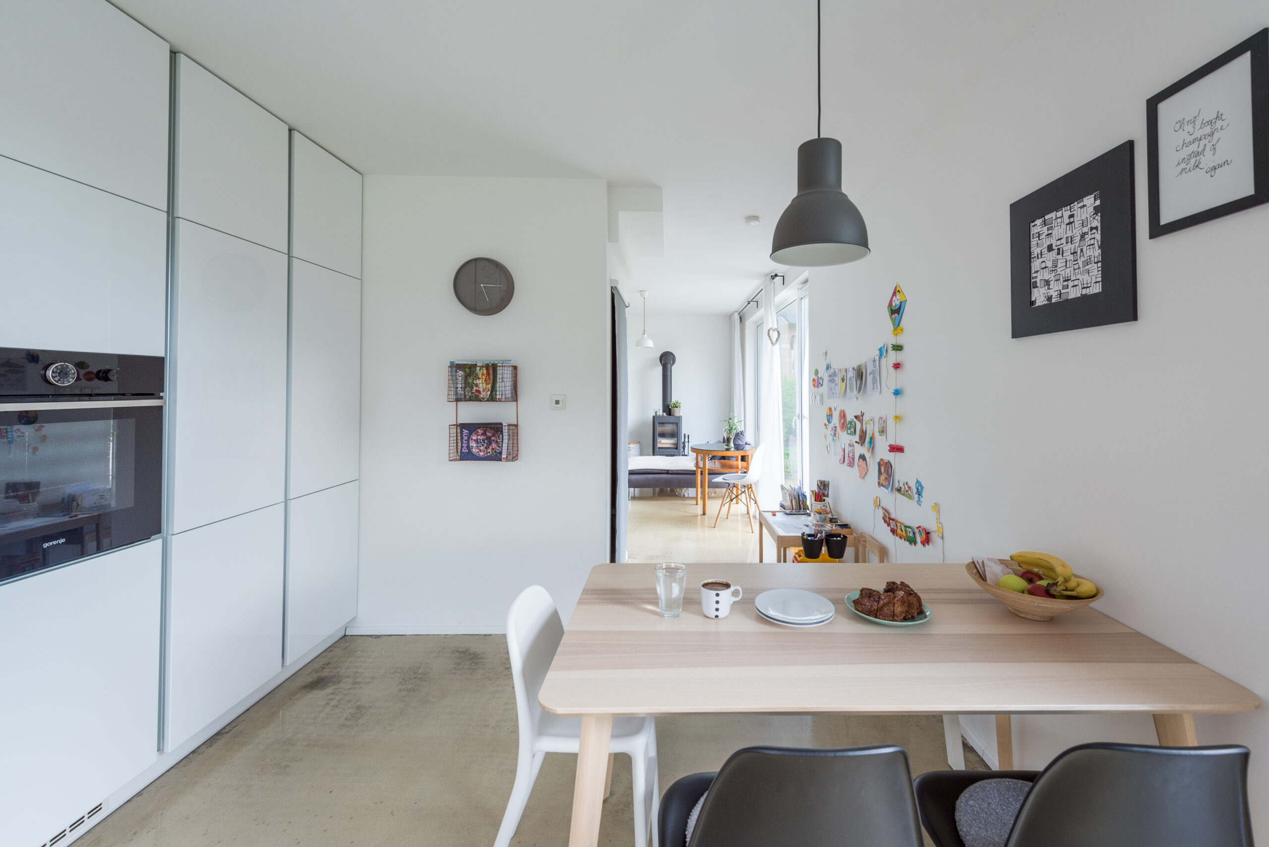 Společenskou část domu rozděluje schodiště na dva samostatné celky - prostorný obývací pokoj a jídelnu s kuchyňským koutem. Z kuchyně je přístupná samostatná spíž sloužící k pohodlnému skladování potravin. Pro navození útulné atmosféry zejména v zimních měsících nechybí ani krb s komínem, který vede po fasádě. Samozřejmostí je také samostatné WC.