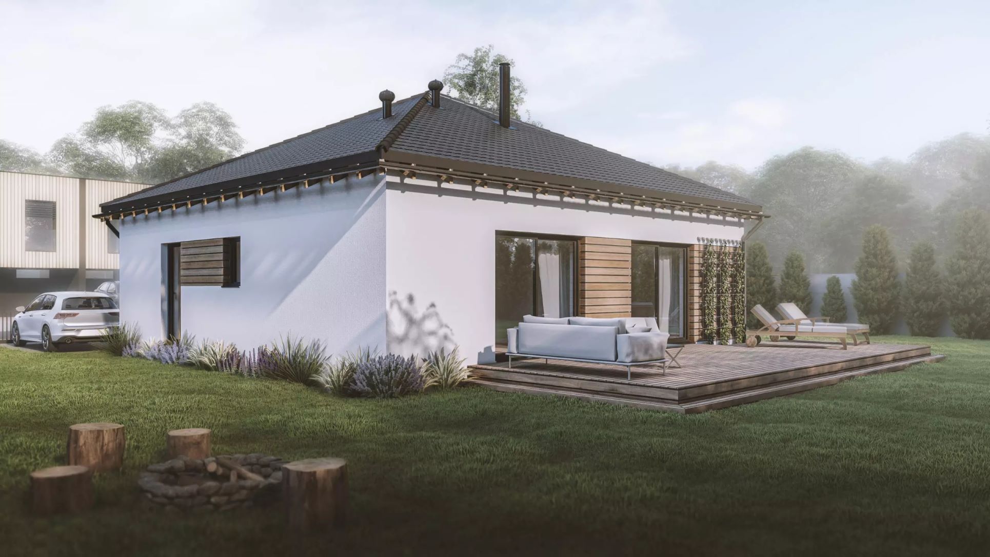 Cena neobsahuje komínový systém a krbovou vložku, žaluzie, kuchyňskou linku ani žádný jiný nábytek, terasu, okapové chodníky, zpevněné plochy na pozemku, přípojky inženýrských sítí, sadové úpravy, oplocení pozemku.