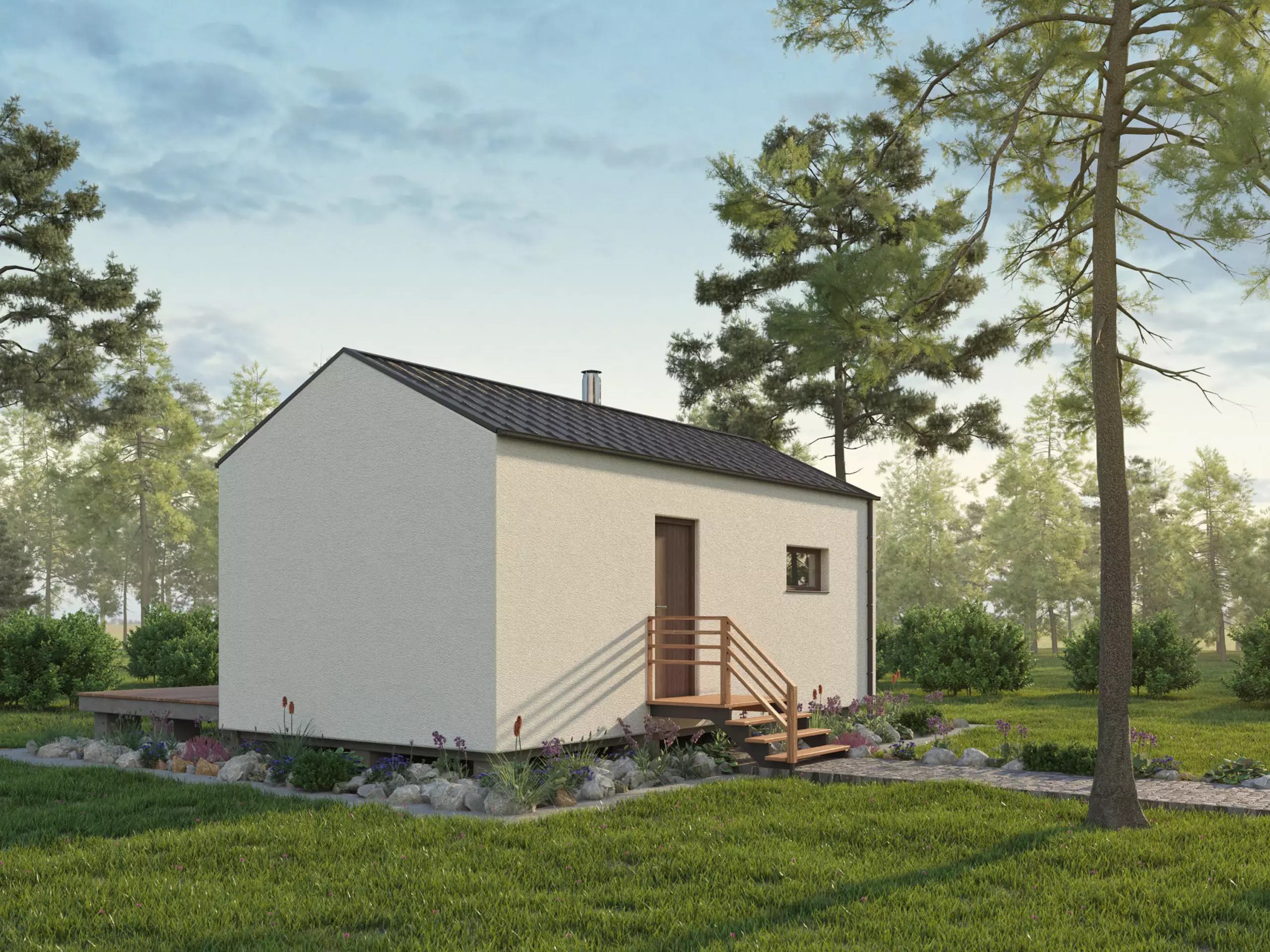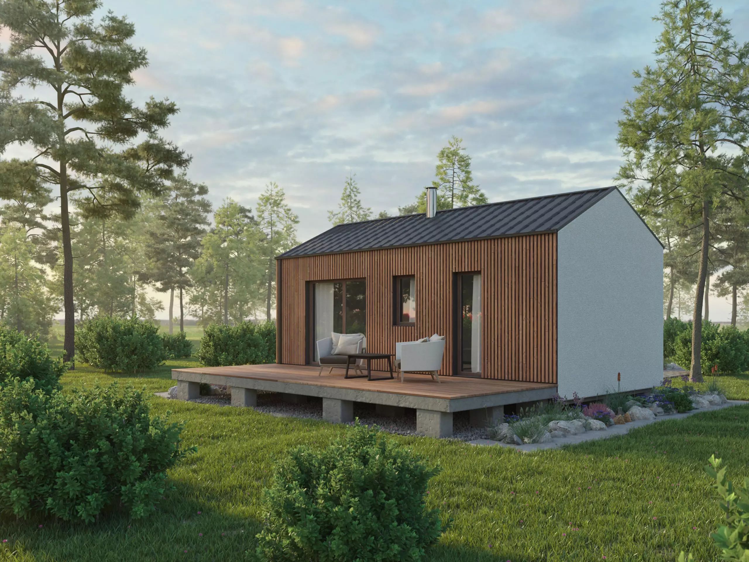 Moderní, cenově dostupný bungalov se sedlovou (lze i pultovou) střechou, který se hodí i na malý pozemek. Dřevěný obklad na části fasády vytváří elegantní vzhled domu. Tento dům patří mezi naše nejmenší a tím i nejdostupnější domy na klíč.