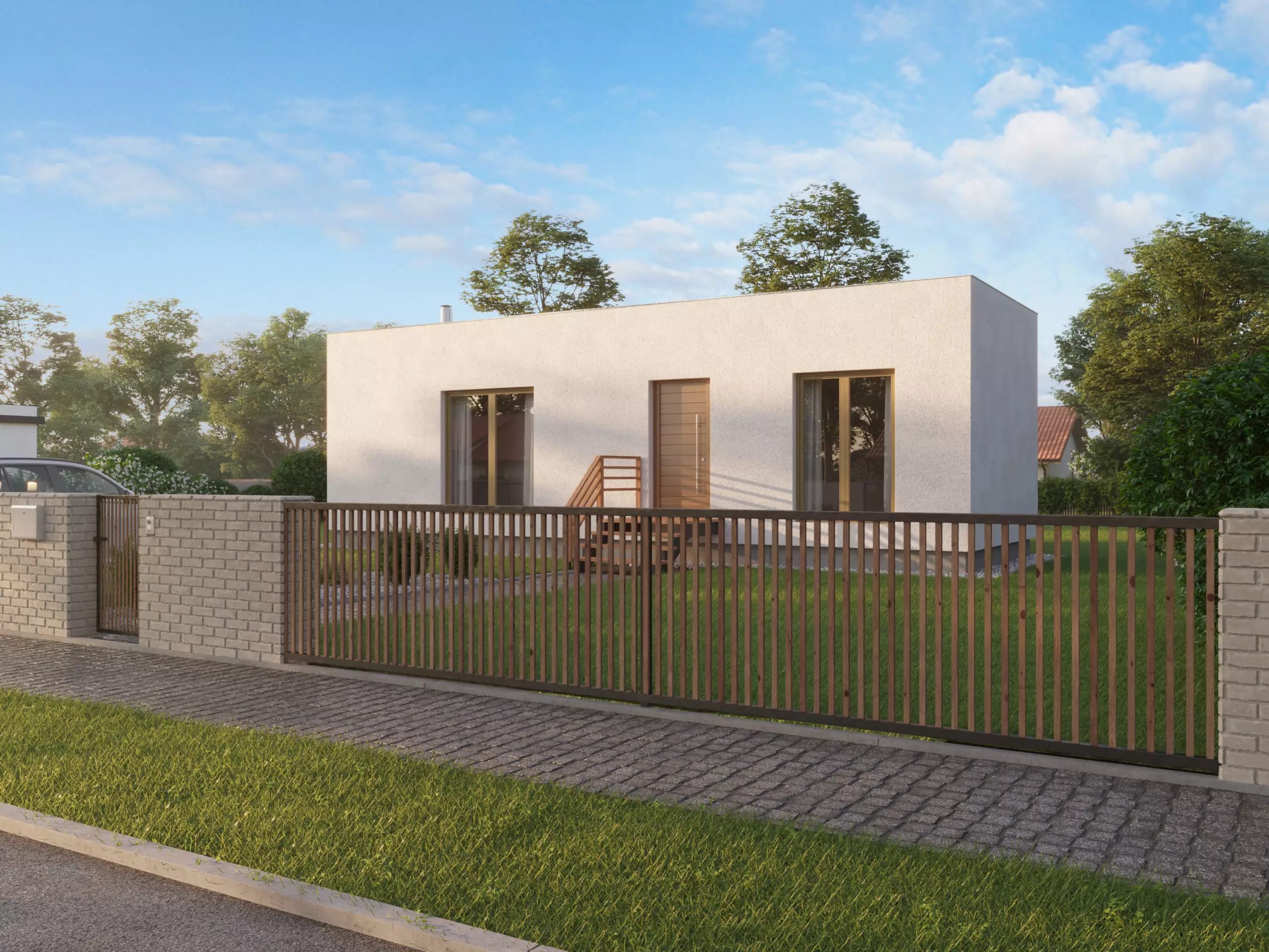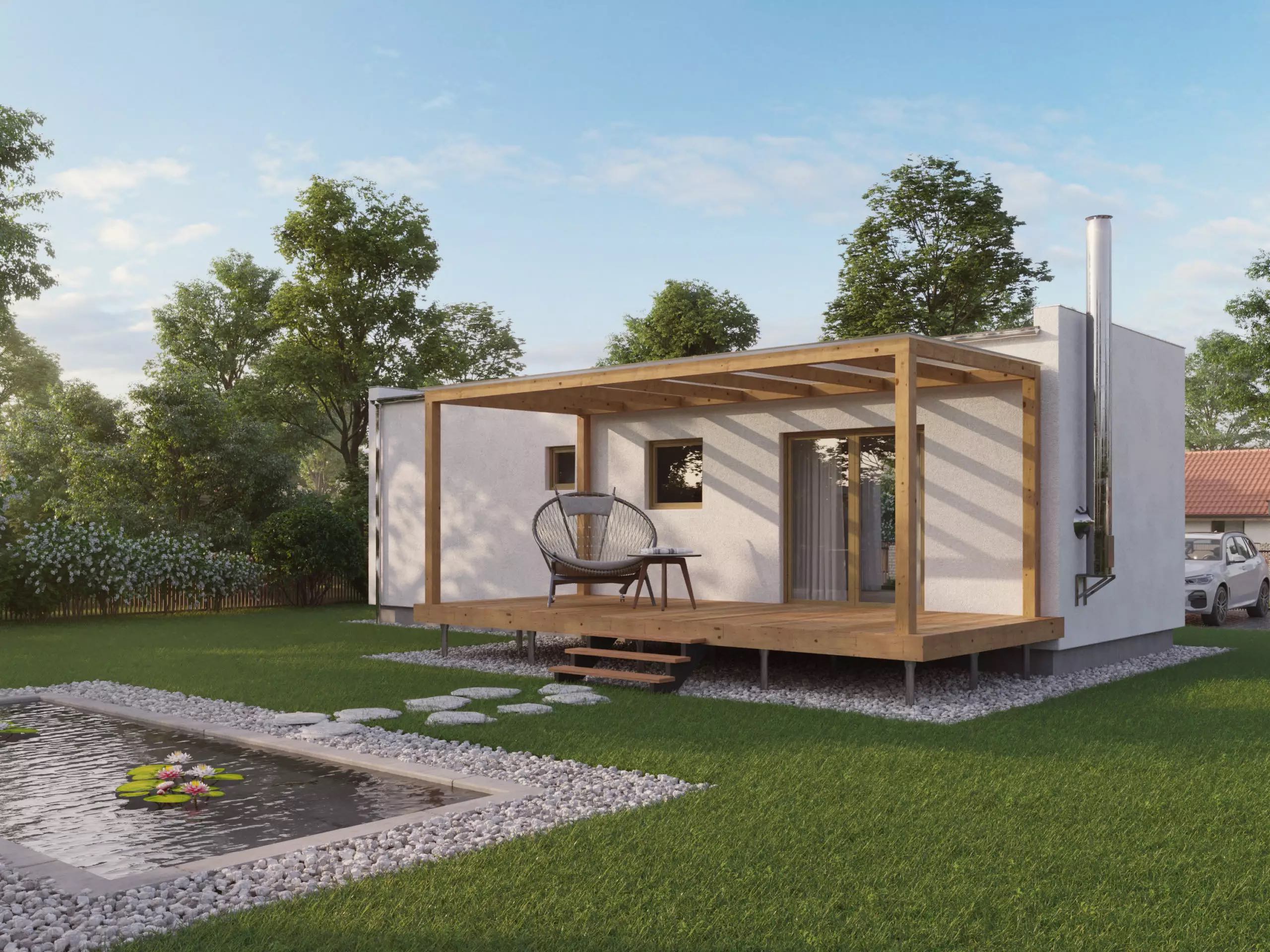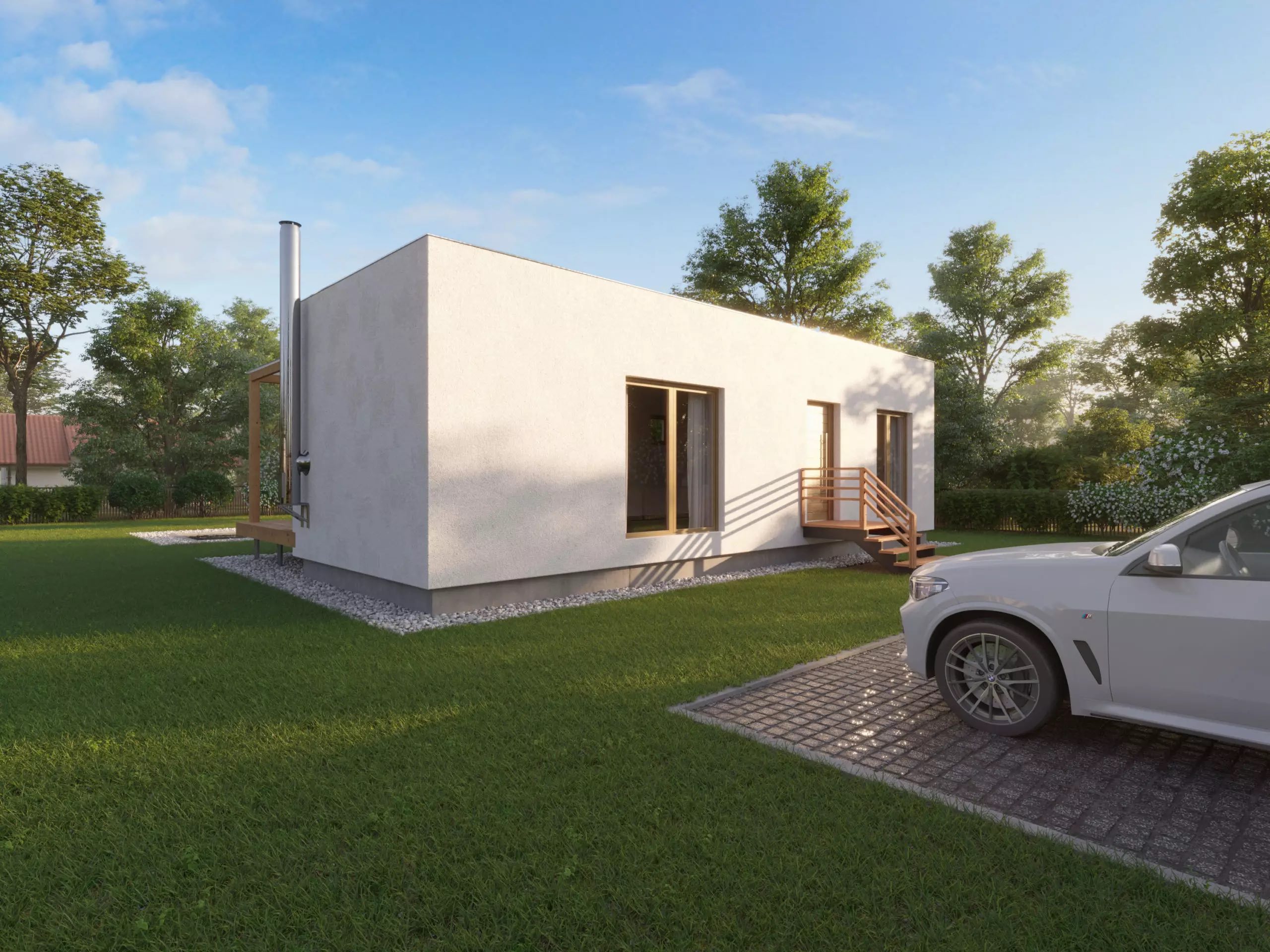 Malý, účelný bungalov s plochou střechou (případně lze zvolit i pultovou nebo sedlovou). Dům má variabilní dispozici, lze ho postavit i ve variantě 2+kk.