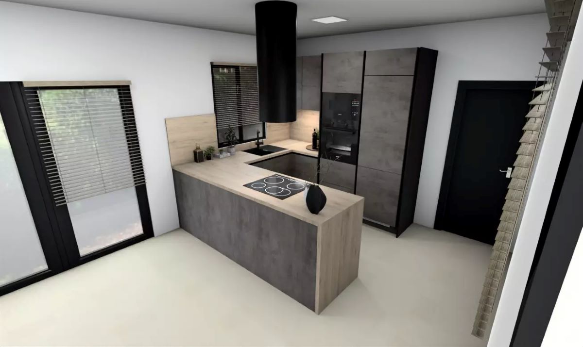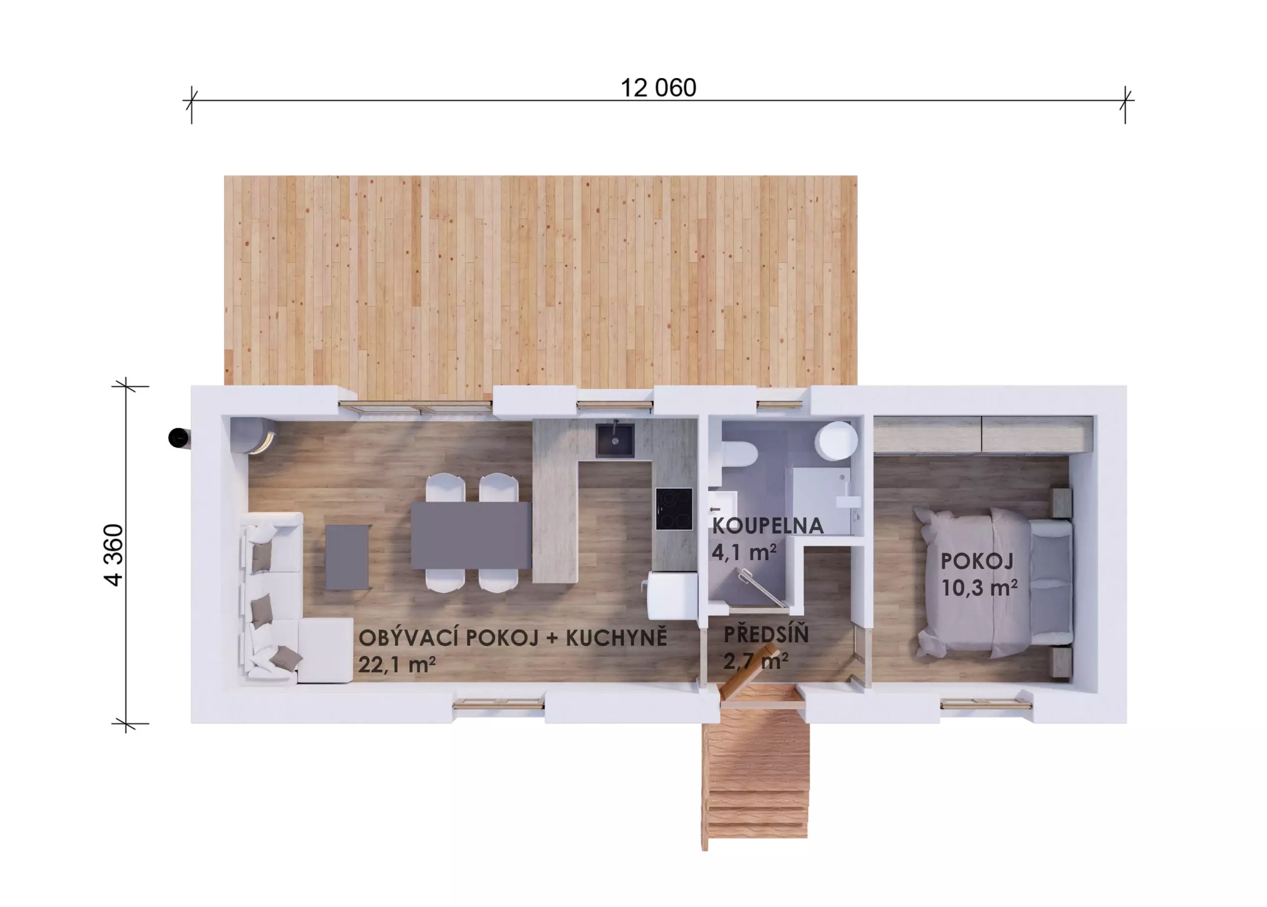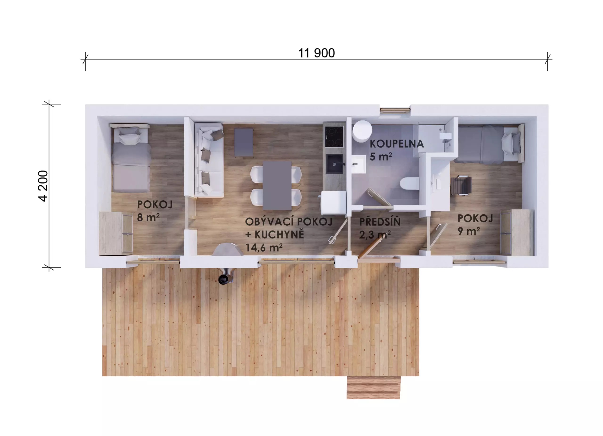 Malý, účelný bungalov s plochou střechou (případně lze zvolit i pultovou nebo sedlovou). Dům má variabilní dispozici, lze ho postavit i ve variantě 2+kk.