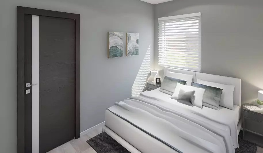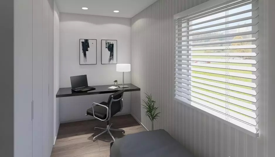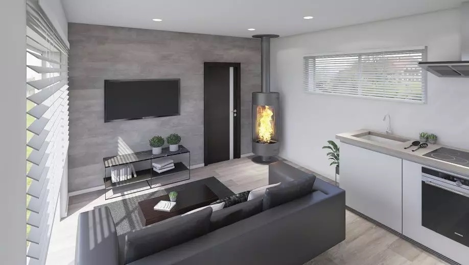 Obytný prostor je propojen s jídelnou a kuchyňským koutem a díky velkým francouzským oknům také s terasou a zahradou. Dále zde najdeme koupelnu se sprchovým koutem a 2 ložnice se vstupem na terasu.