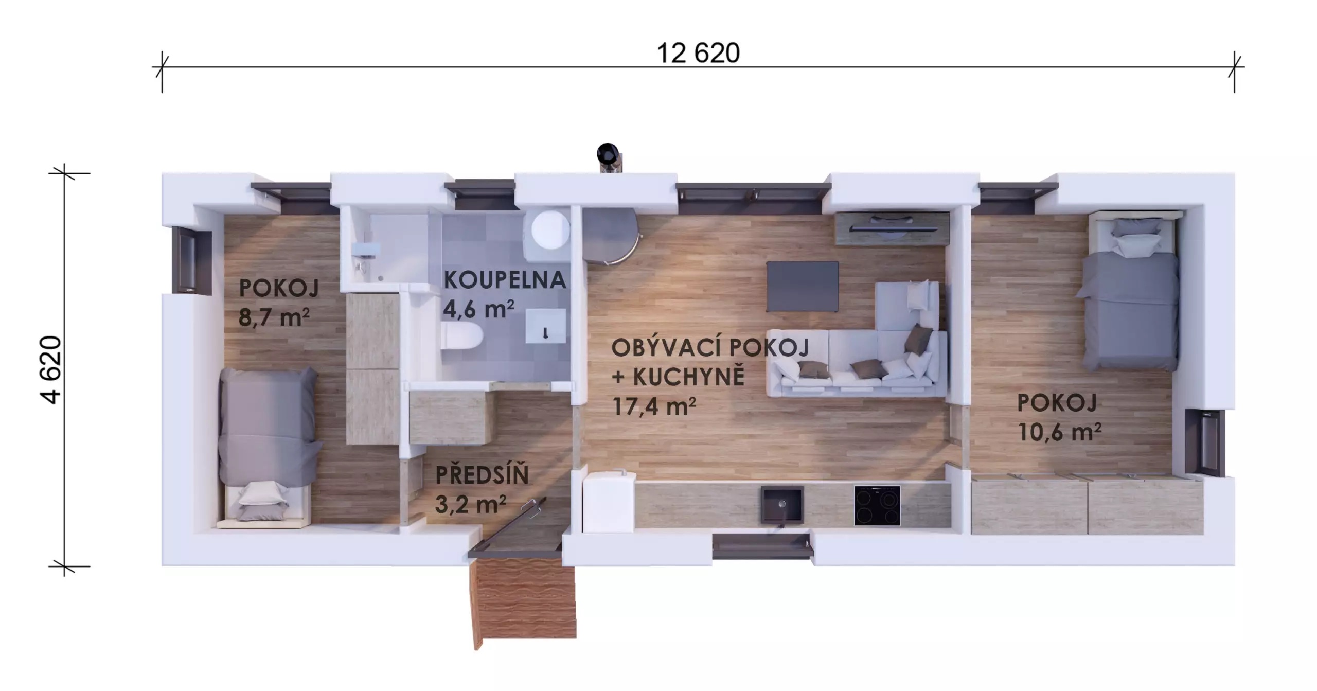 Vnitřní dispozice domu lze upravit na variantu 2+kk.