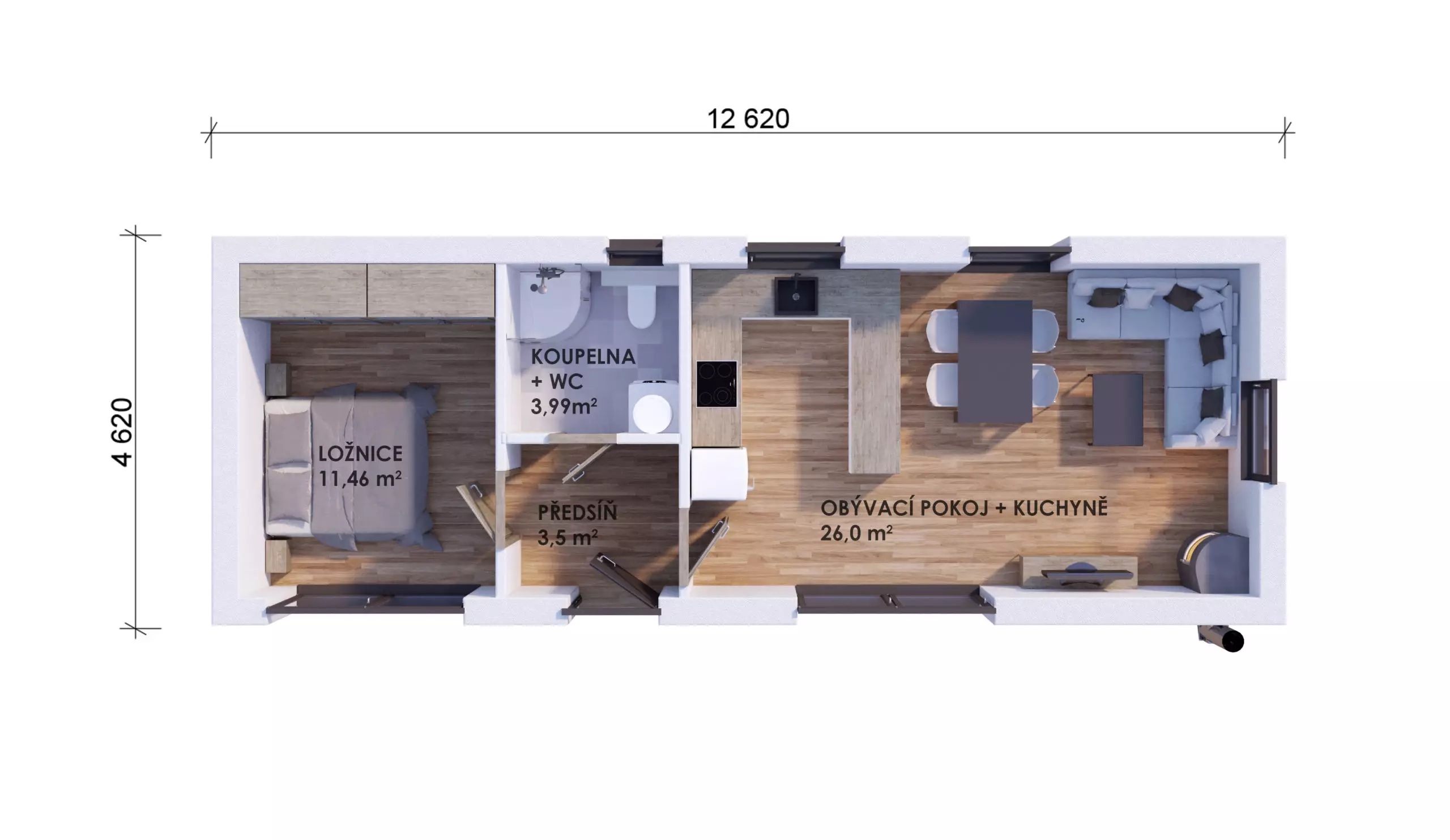 V centrální části domu najdeme obývací pokoj s krbem a kuchyňským koutem. Prostor je prosvětlen velkým francouzským oknem. Dále zde najdeme 2 ložnice a koupelnu se sprchovým koutem. V pokojích je navržen prostor pro instalaci vestavěných skříní.